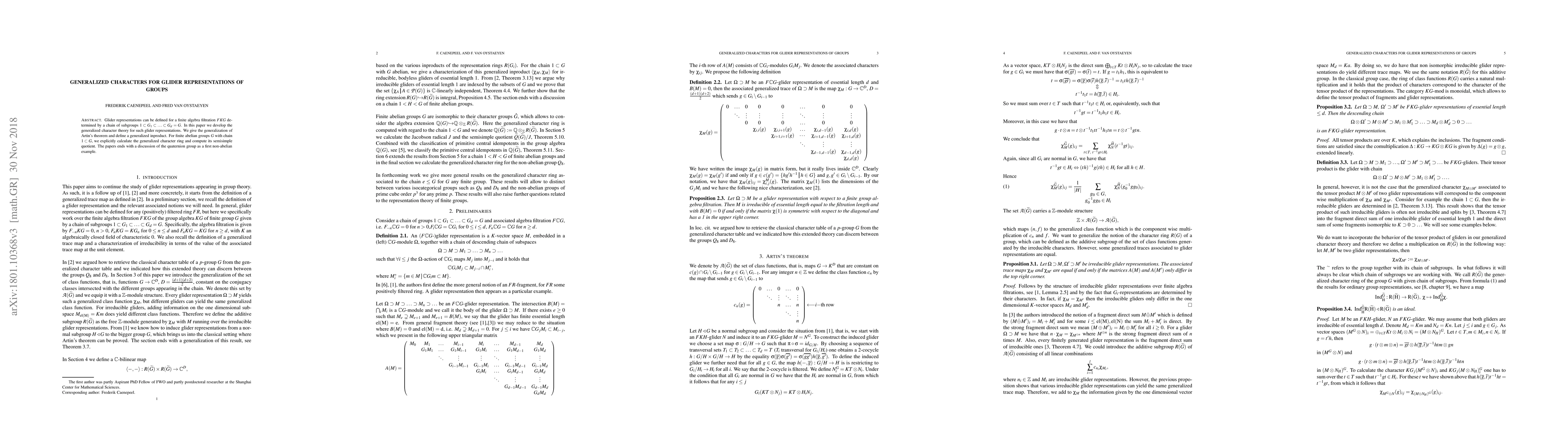 This paper develops the generalized character theory for glider representations in finite algebra filtrations, extending Artin's theorem and defining a generalized inner product. It explicitly calculates the generalized character ring for finite abelian groups and computes its semisimple quotient, concluding with a study of the quaternion group as a non-abelian example.