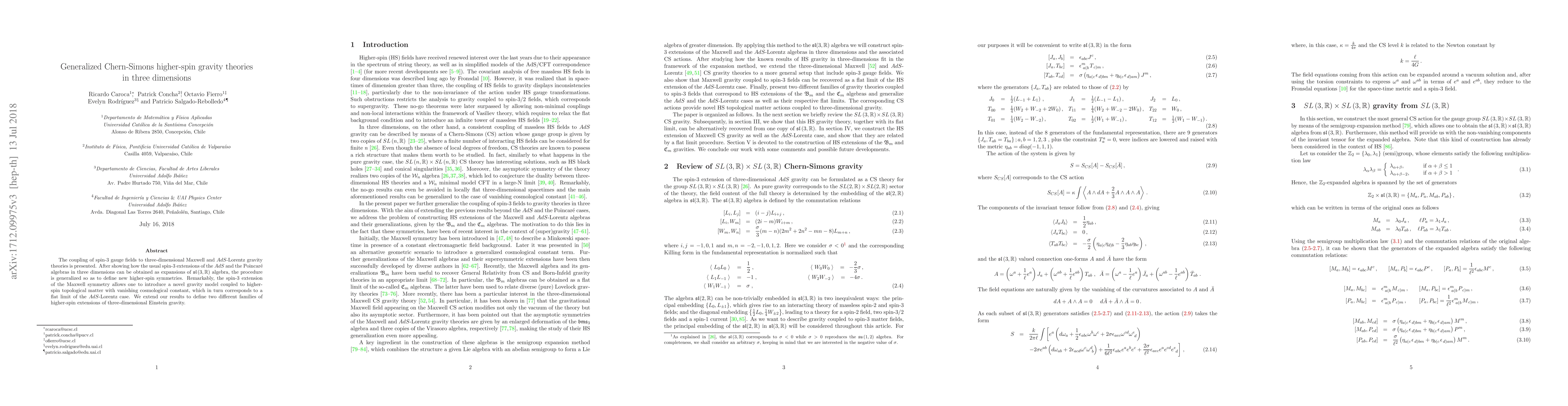 The coupling of spin-3 gauge fields to three-dimensional Maxwell and $AdS$-Lorentz gravity theories is presented. After showing how the usual spin-3 extensions of the $AdS$ and the Poincar\'e algebras in three dimensions can be obtained as expansions of $\mathfrak{sl}\left( 3,\mathbb{R}\right)$ algebra, the procedure is generalized so as to define new higher-spin symmetries. Remarkably, the spin-3 extension of the Maxwell symmetry allows one to introduce a novel gravity model coupled to higher-spin topological matter with vanishing cosmological constant, which in turn corresponds to a flat limit of the $AdS$-Lorentz case. We extend our results to define two different families of higher-spin extensions of three-dimensional Einstein gravity.