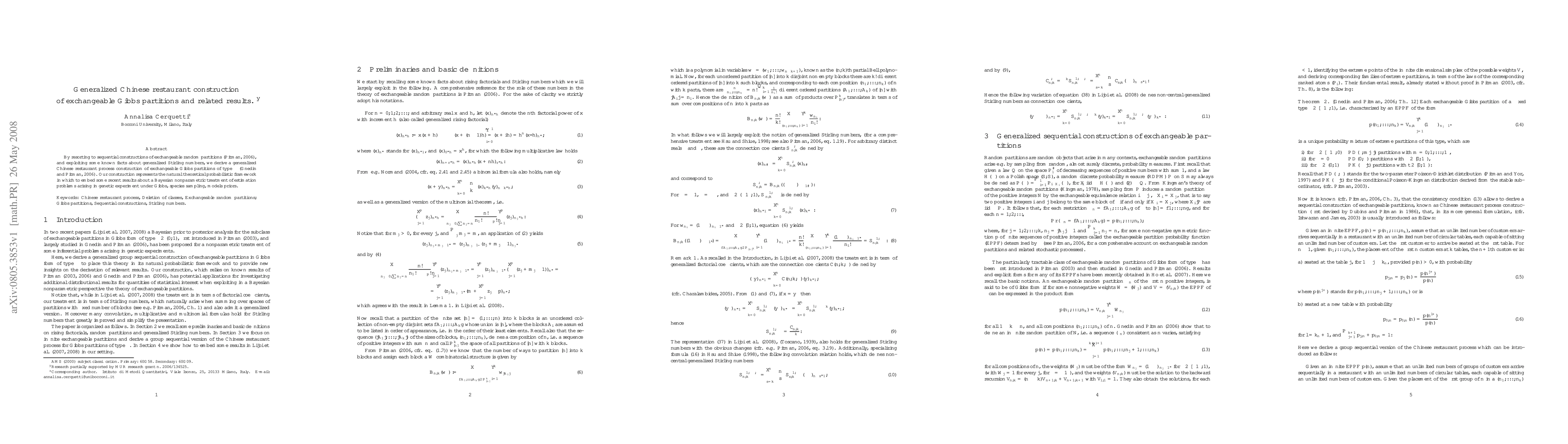 This paper presents a generalized Chinese restaurant process construction for exchangeable Gibbs partitions, leveraging sequential partition constructions and generalized Stirling numbers. It provides a probabilistic framework for Bayesian nonparametric estimation in genetic experiments under Gibbs species sampling models.