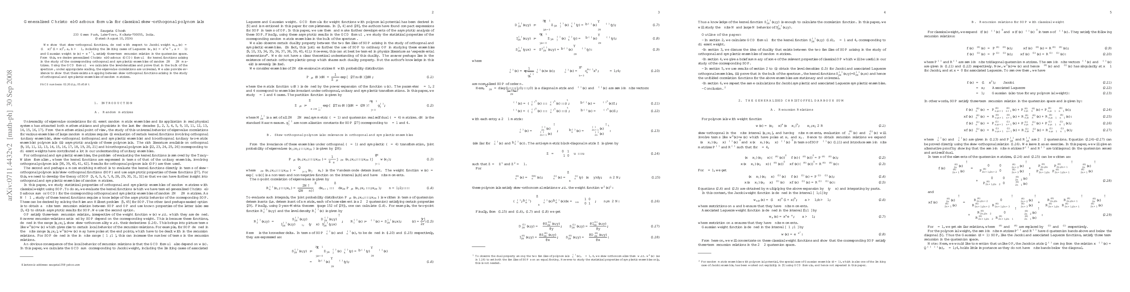 We show that skew-orthogonal functions, defined with respect to Jacobi weight $w_{a,b}(x)={(1-x)}^a{(1+x)}^b$, $a$, $b>-1$, including the limiting cases of Laguerre ($w_{a}(x)=x^{a}e^{-x}$, $a > -1$) and Gaussian weight ($w(x)=e^{-x^2}$), satisfy three-term recursion relation in the quaternion space. From this, we derive generalized Christoffel-Darboux (GCD) formul\ae\ for kernel functions arising in the study of the corresponding orthogonal and symplectic ensembles of random $2N\times 2N$ matrices. Using the GCD formul\ae we calculate the level-densities and prove that in the bulk of the spectrum, under appropriate scaling, the eigenvalue correlations are universal. We also provide evidence to show that there exists a mapping between skew-orthogonal functions arising in the study of orthogonal and symplectic ensembles of random matrices.