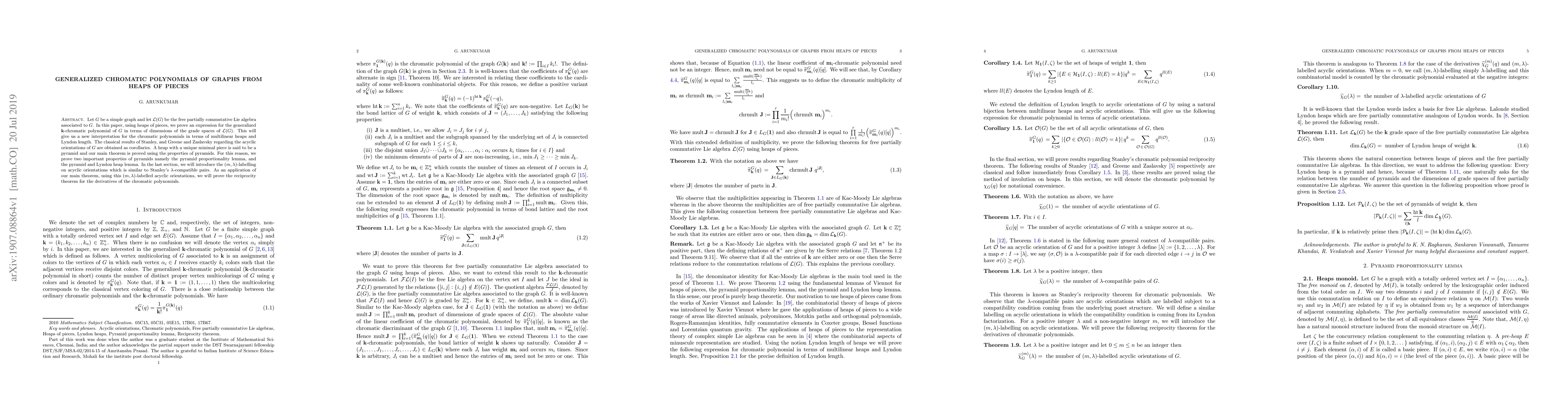 This paper derives the generalized $\textbf k$-chromatic polynomial of a graph $G$ using heaps of pieces and properties of pyramids, providing a new interpretation in terms of multilinear heaps and Lyndon length. It also proves the reciprocity theorem for derivatives of chromatic polynomials using $(m,\lambda)$-labelled acyclic orientations.