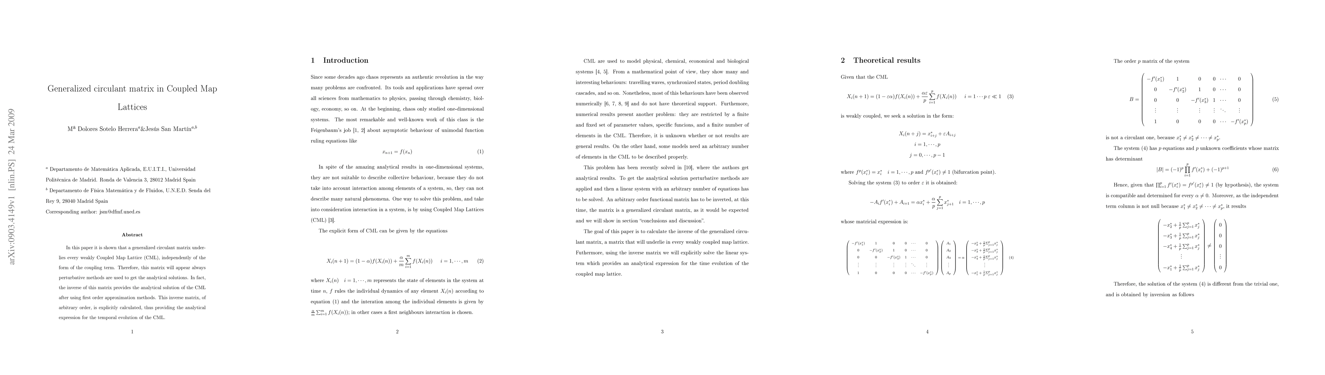 In this paper it is shown that a generalized circulant matrix underlies every weakly Coupled Map Lattice (CML), independently of the form of the coupling term. Therefore, this matrix will appear always perturbative methods are used to get the analytical solutions. In fact, the inverse of this matrix provides the analytical solution of the CML after using first order approximation methods. This inverse matrix, of arbitrary order, is explicitly calculated, thus providing the analytical expression for the temporal evolution of the CML.