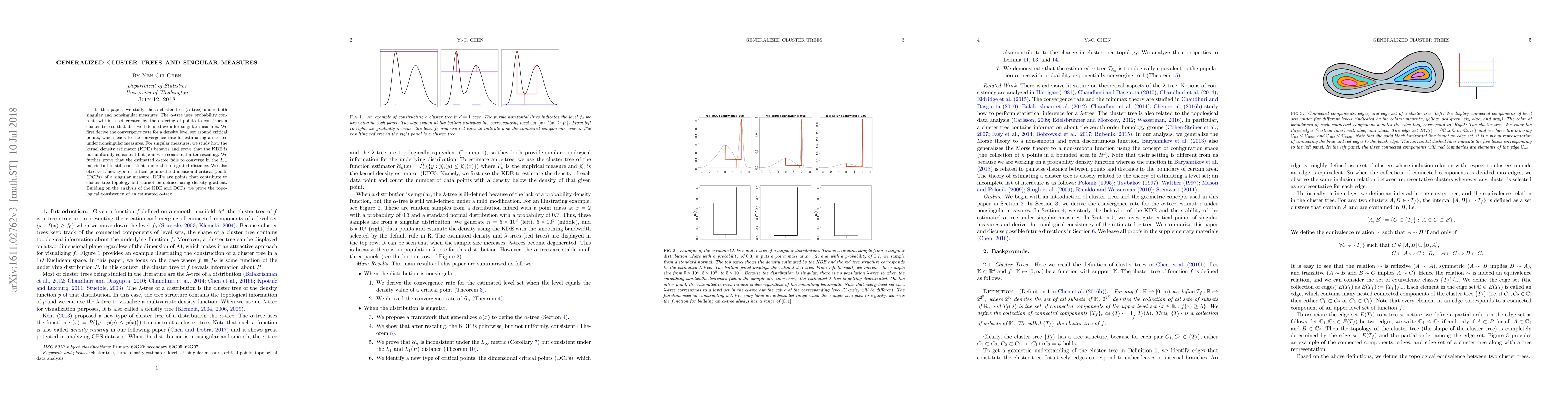 Researchers studied the behavior of cluster trees under singular and nonsingular measures, finding that the estimated tree can converge in certain metrics but not others, with new critical points like dimensional critical points contributing to its topology.