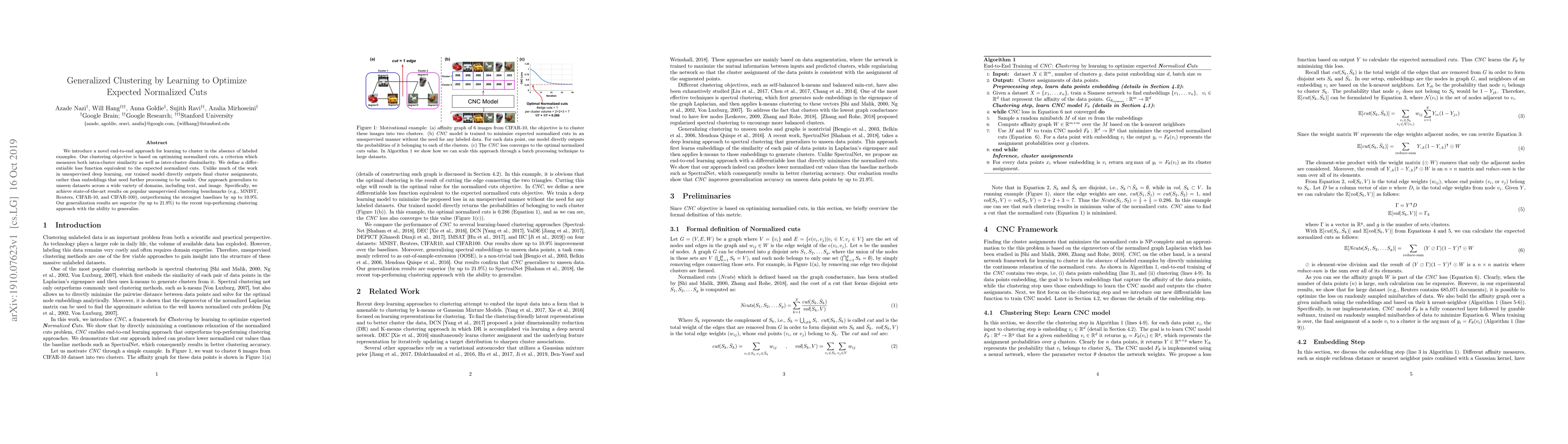 We introduce a novel end-to-end approach for learning to cluster in the absence of labeled examples. Our clustering objective is based on optimizing normalized cuts, a criterion which measures both intra-cluster similarity as well as inter-cluster dissimilarity. We define a differentiable loss function equivalent to the expected normalized cuts. Unlike much of the work in unsupervised deep learning, our trained model directly outputs final cluster assignments, rather than embeddings that need further processing to be usable. Our approach generalizes to unseen datasets across a wide variety of domains, including text, and image. Specifically, we achieve state-of-the-art results on popular unsupervised clustering benchmarks (e.g., MNIST, Reuters, CIFAR-10, and CIFAR-100), outperforming the strongest baselines by up to 10.9%. Our generalization results are superior (by up to 21.9%) to the recent top-performing clustering approach with the ability to generalize.