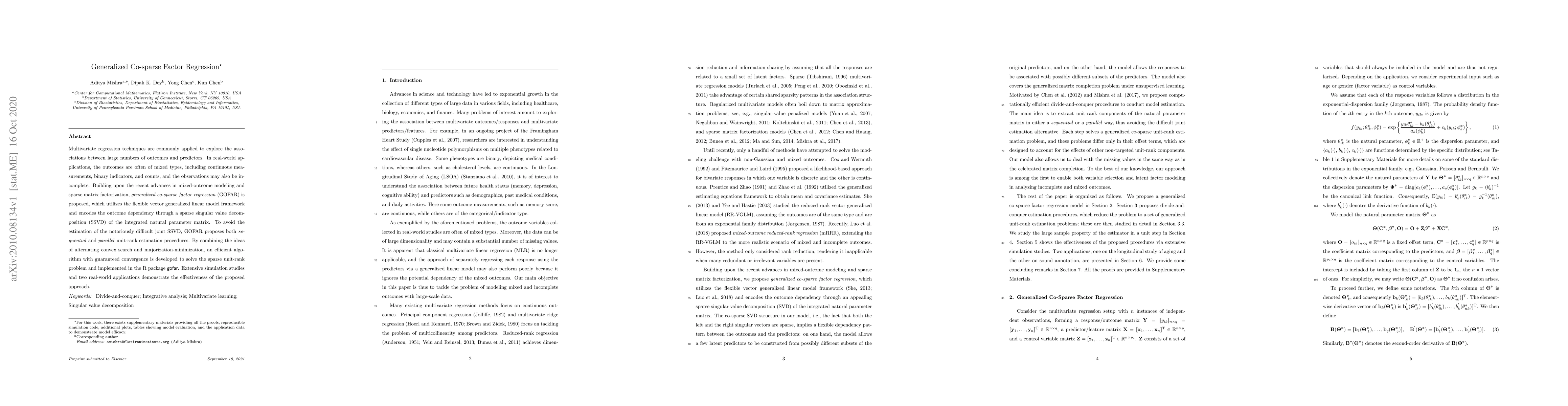 The paper proposes generalized co-sparse factor regression (GOFAR) to handle mixed-type outcomes in multivariate regression, utilizing a vector generalized linear model and sparse singular value decomposition. An efficient algorithm with guaranteed convergence is developed to solve the sparse unit-rank estimation problem, implemented in the R package gofar, and validated through simulations and real-world applications.