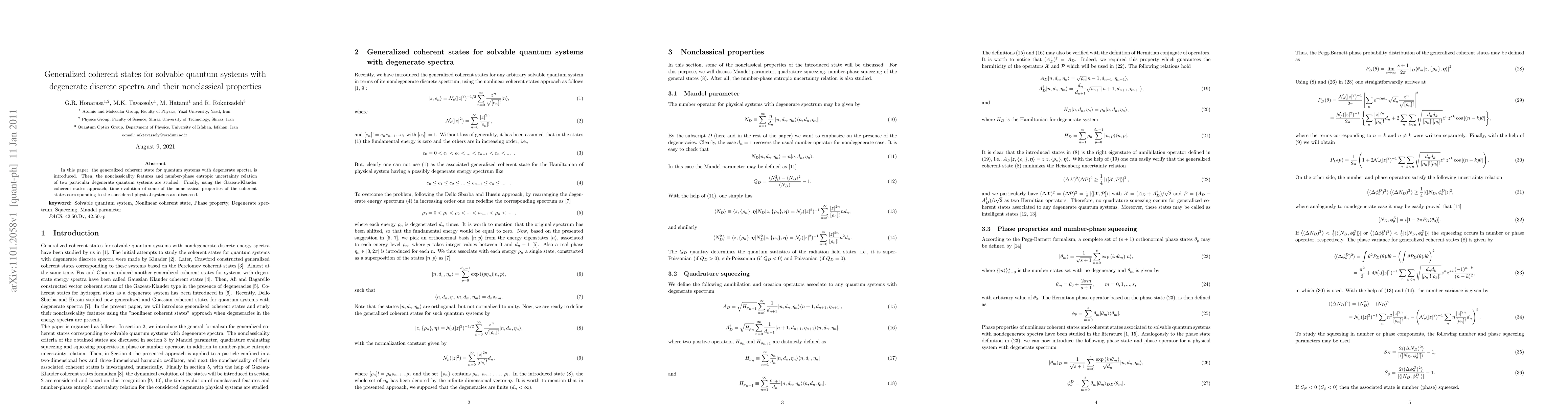 This paper introduces generalized coherent states for quantum systems with degenerate spectra and explores their nonclassical properties, including the number-phase entropic uncertainty relation. It also examines the time evolution of these properties using the Gazeau-Klauder coherent states approach.