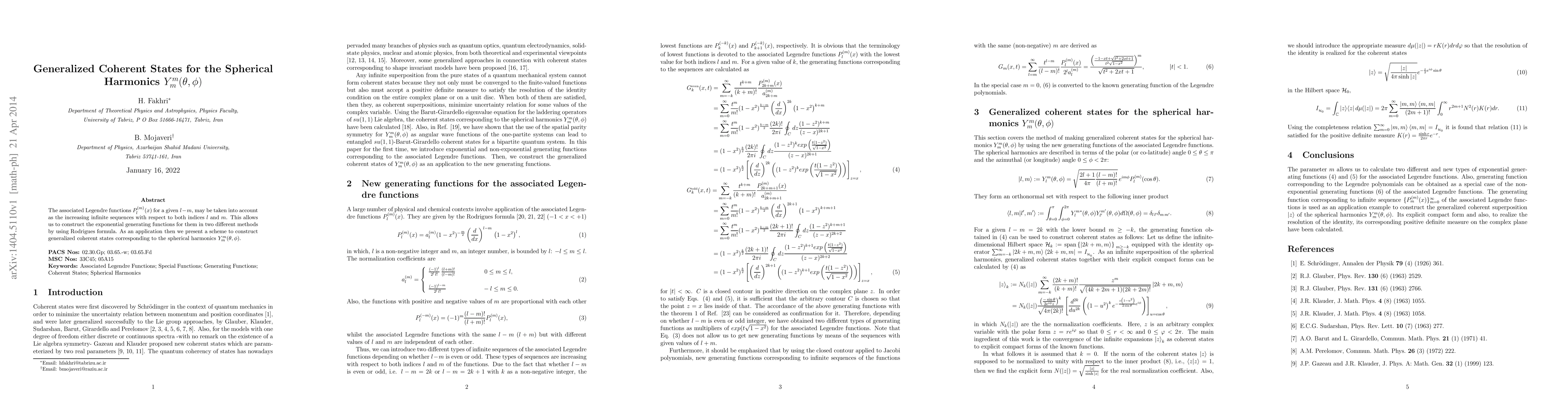 The associated Legendre functions $P_{l}^{(m)}(x)$ for a given $l-m$, may be taken into account as the increasing infinite sequences with respect to both indices $l$ and $m$. This allows us to construct the exponential generating functions for them in two different methods by using Rodrigues formula. As an application then we present a scheme to construct generalized coherent states corresponding to the spherical harmonics $Y_{m}^{m}(\theta,\phi)$.