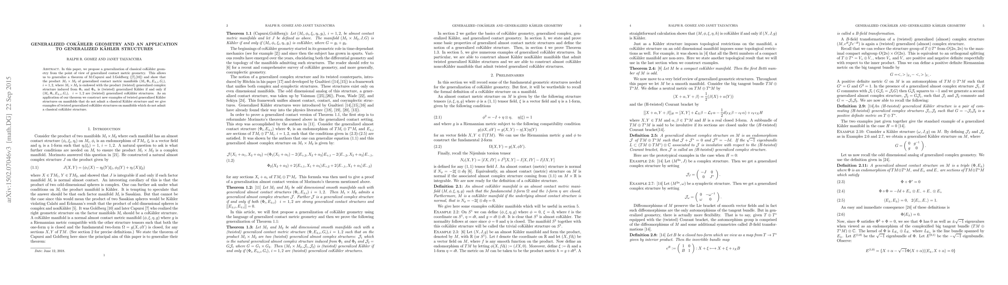 In this paper we define the notion of a generalized coK\"ahler structure and prove that the product $M_{1}\times M_{2}$ of generalized contact metric manifolds $(M_i, \Phi_i,E_{\pm,i}, G_i)$, $ i=1, 2$, where $M_{1}\times M_{2}$ is endowed with the product generalized complex structure induced from $\Phi_1$ and $\Phi_2$, is generalized K\"ahler if and only if $(M_i, \Phi_i, E_{\pm,i}, G_i) ,\ \ i=1,2$ are generalized coK\"ahler structures. We also prove that products of generalized coK\"ahler and generalized K\"ahler manifolds admit a generalized coK\"ahler structure. We use these product constructions to give nontrivial examples of generalized coK\"ahler structures. Finally, we show the analogs of these theorems hold in the setting of twisted generalized geometries. We use these theorems to construct new examples of twisted generalized K\"ahler structures on manifolds that do not admit a classical K\"ahler structure and we give examples of twisted generalized coK\"ahler structures on manifolds which do not admit a classical coK\"ahler structure.