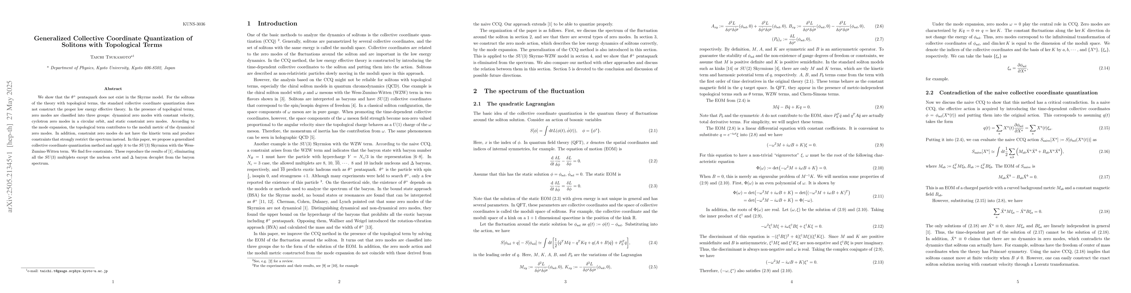 We show that the $\theta+$ pentaquark does not exist in the Skyrme model. For the solitons of the theory with topological terms, the standard collective coordinate quantization does not construct the proper low energy effective theory. In the presence of topological terms, zero modes are classified into three groups: dynamical zero modes with constant velocity, cyclotron zero modes in a circular orbit, and static constraint zero modes. According to the mode expansion, the topological term contributes to the moduli metric of the dynamical zero modes. In addition, constraint zero modes do not have the kinetic term and produce constraints that strongly restrict the spectrum instead. In this paper, we propose a generalized collective coordinate quantization method and apply it to the SU(3) Skyrmion with the Wess- Zumino-Witten term. We find five constraints. These reproduce the results of [1], eliminating all the SU(3) multiplets except the nucleon octet and $\Delta$ baryon decuplet from the baryon spectrum.