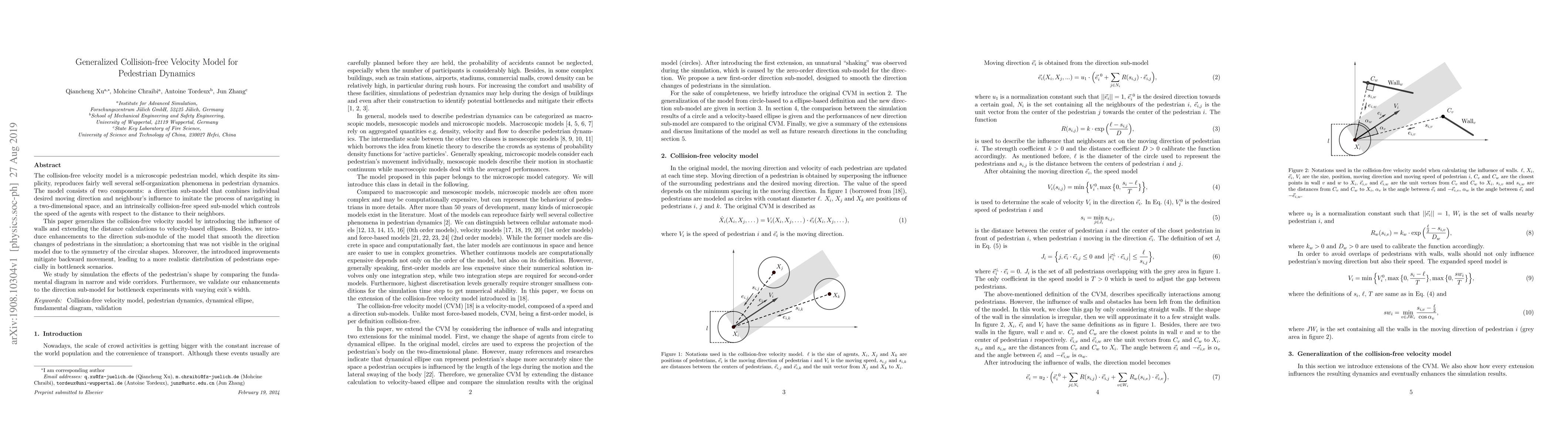 The collision-free velocity model is a microscopic pedestrian model, which despite its simplicity, reproduces fairly well several self-organization phenomena in pedestrian dynamics. The model consists of two components: a direction sub-model that combines individual desired moving direction and neighbor's influence to imitate the process of navigating in a two-dimensional space, and an intrinsically collision-free speed sub-model which controls the speed of the agents with respect to the distance to their neighbors. In this paper we generalize the collision-free velocity model by introducing the influence of walls and extending the distance calculations to velocity-based ellipses. Besides, we introduce enhancements to the direction sub-module that smooth the direction changes of pedestrians in the simulation; a shortcoming that was not visible in the original model due to the symmetry of the circular shapes. Moreover, the introduced improvements mitigate backward movements, leading to a more realistic distribution of pedestrians especially in bottleneck scenarios. We study by simulation the effects of the pedestrian's shape by comparing the fundamental diagram in narrow and wide corridors. Furthermore, we validate our generalized approach by investigating the flow through bottlenecks with varying exit's widths.