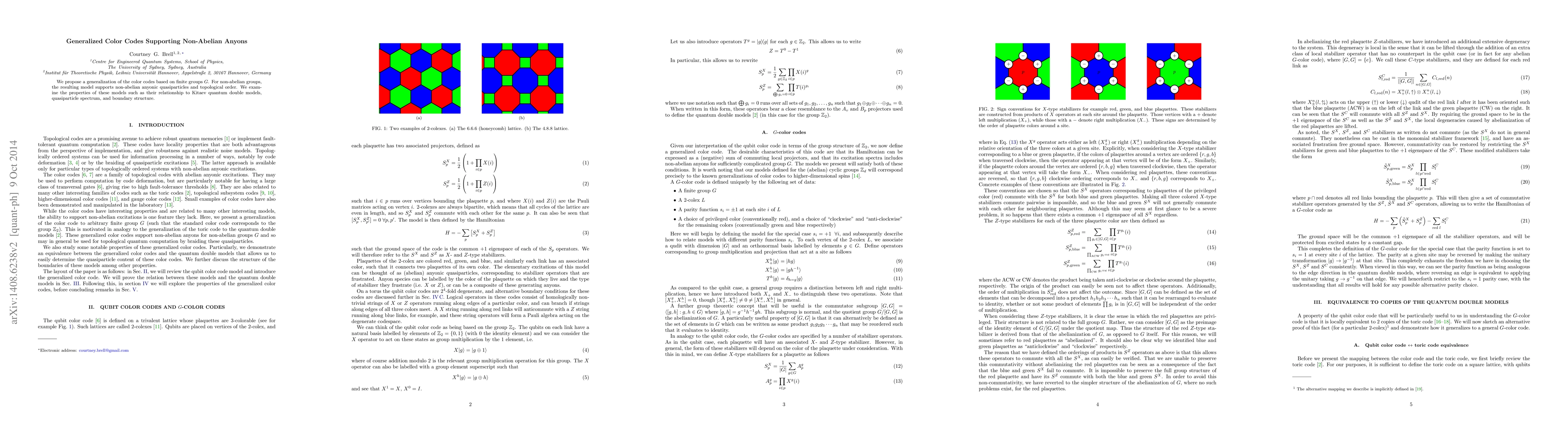 This paper generalizes color codes using finite groups $G$ to support non-abelian anyons and topological order, exploring their connections to Kitaev quantum double models and analyzing their quasiparticle spectrum and boundary structure.