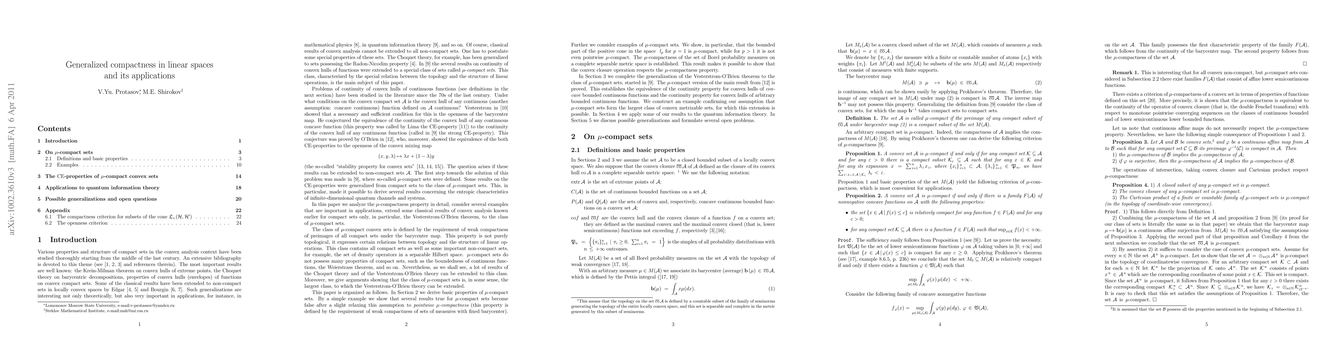 The class of subsets of locally convex spaces called $\mu$-compact sets is considered. This class contains all compact sets as well as several noncompact sets widely used in applications. It is shown that many results well known for compact sets can be generalized to $\mu$-compact sets. Several examples are considered. The main result of the paper is a generalization to $\mu$-compact convex sets of the Vesterstrom-O'Brien theorem showing equivalence of the particular properties of a compact convex set (s.t. openness of the mixture map, openness of the barycenter map and of its restriction to maximal measures, continuity of a convex hull of any continuous function, continuity of a convex hull of any concave continuous function). It is shown that the Vesterstrom-O'Brien theorem does not hold for pointwise $\mu$-compact convex sets defined by the slight relaxing of the $\mu$-compactness condition. Applications of the obtained results to quantum information theory are considered.
