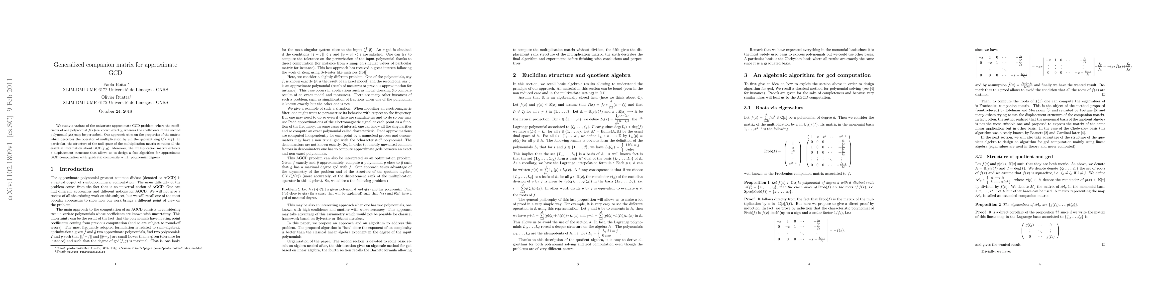 We study a variant of the univariate approximate GCD problem, where the coefficients of one polynomial f(x)are known exactly, whereas the coefficients of the second polynomial g(x)may be perturbed. Our approach relies on the properties of the matrix which describes the operator of multiplication by gin the quotient ring C[x]=(f). In particular, the structure of the null space of the multiplication matrix contains all the essential information about GCD(f; g). Moreover, the multiplication matrix exhibits a displacement structure that allows us to design a fast algorithm for approximate GCD computation with quadratic complexity w.r.t. polynomial degrees.