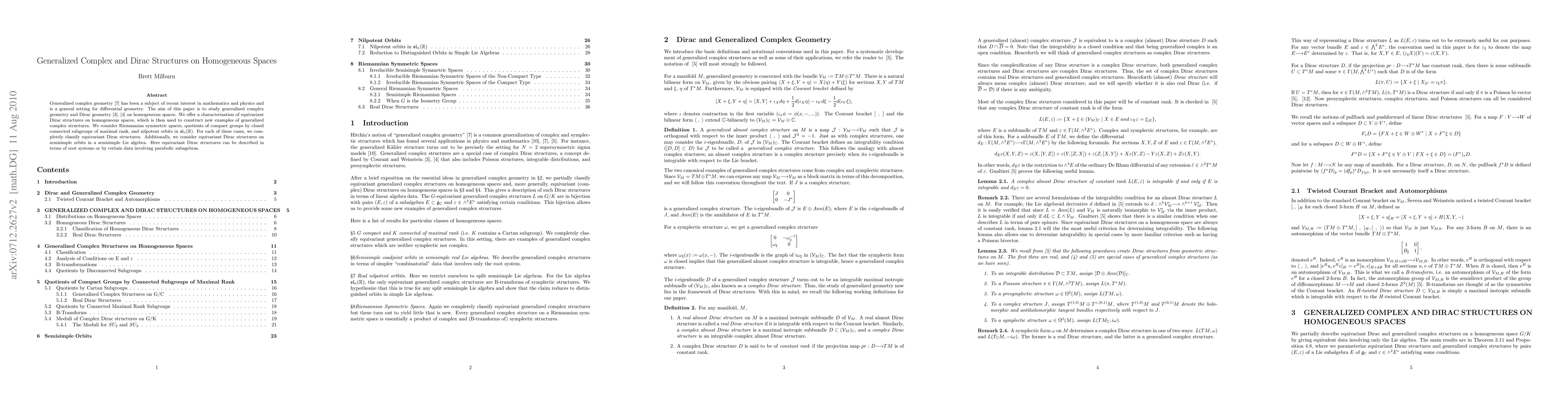 This paper classifies equivariant Dirac and generalized complex structures on homogeneous spaces $G/K$, reducing the analysis to the Lie algebra, and provides complete classifications for Riemannian symmetric spaces and compact groups modulo subgroups containing a Cartan subgroup.