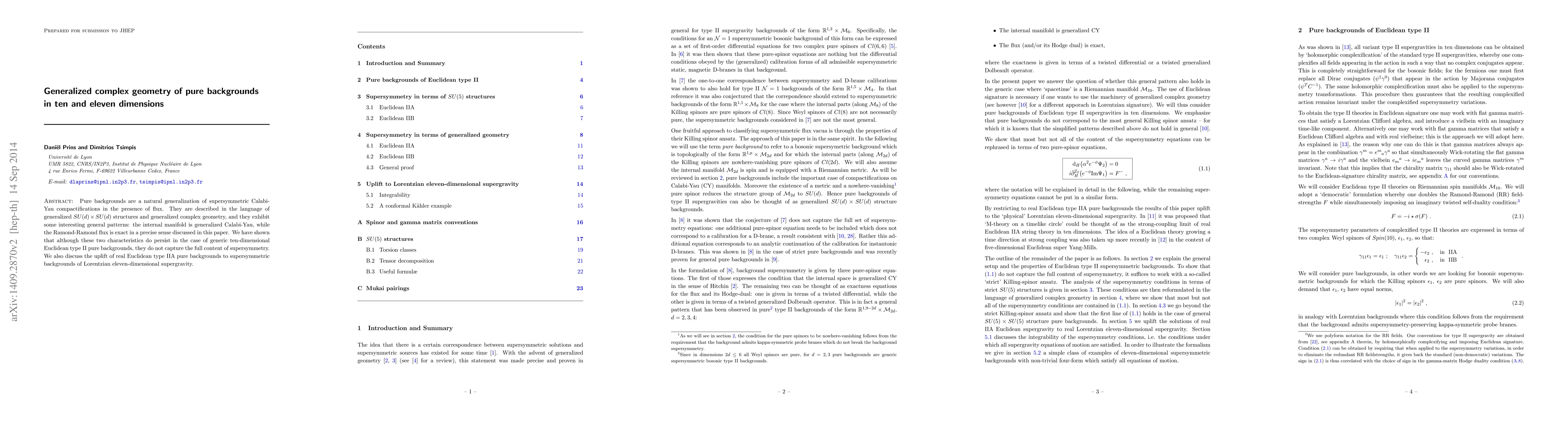 Pure backgrounds are a natural generalization of supersymmetric Calabi-Yau compactifications in the presence of flux. They are described in the language of generalized SU(d) x SU(d) structures and generalized complex geometry, and they exhibit some interesting general patterns: the internal manifold is generalized Calabi-Yau, while the Ramond-Ramond flux is exact in a precise sense discussed in this paper. We have shown that although these two characteristics do persist in the case of generic ten-dimensional Euclidean type II pure backgrounds, they do not capture the full content of supersymmetry. We also discuss the uplift of real Euclidean type IIA pure backgrounds to supersymmetric backgrounds of Lorentzian eleven-dimensional supergravity.