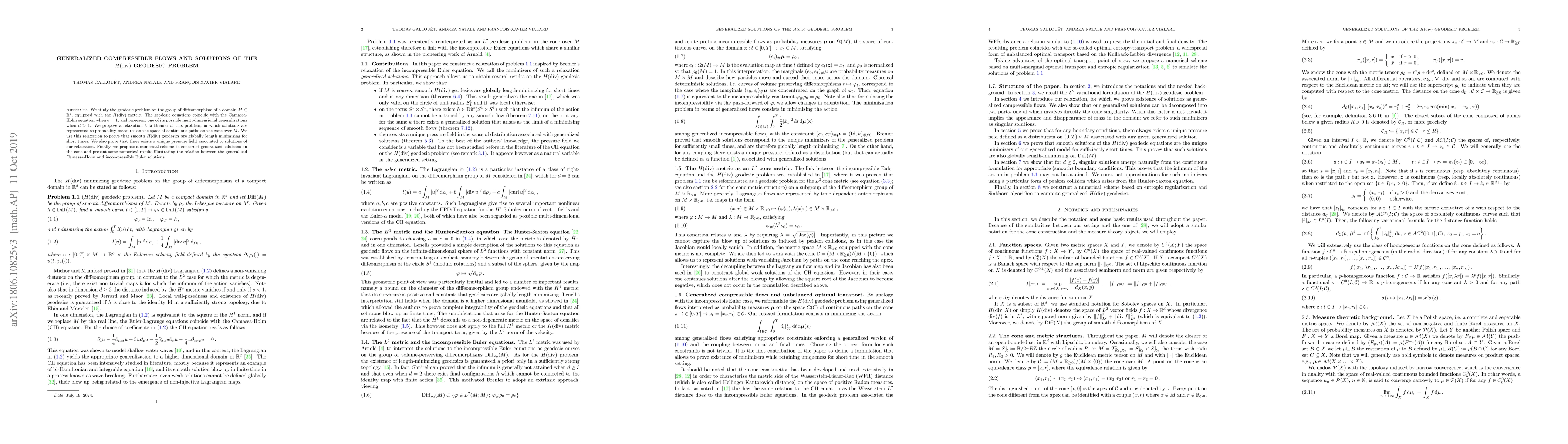 This paper explores the geodesic problem in the H(div) metric on the group of diffeomorphisms of a domain, proposing a relaxation method to represent solutions as probability measures. It proves that smooth geodesics are globally length minimizing and introduces a unique pressure field, alongside a numerical scheme for constructing generalized solutions.