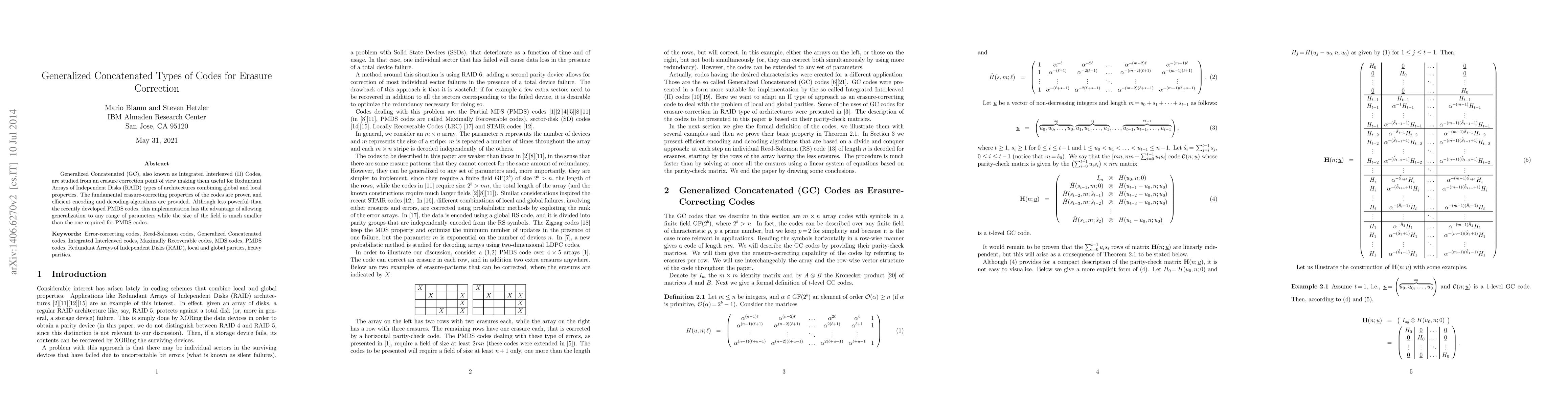 This paper explores Generalized Concatenated Codes for erasure correction, offering efficient encoding and decoding algorithms. While less powerful than PMDS codes, they provide a generalized approach with a smaller field size, making them suitable for RAID architectures.