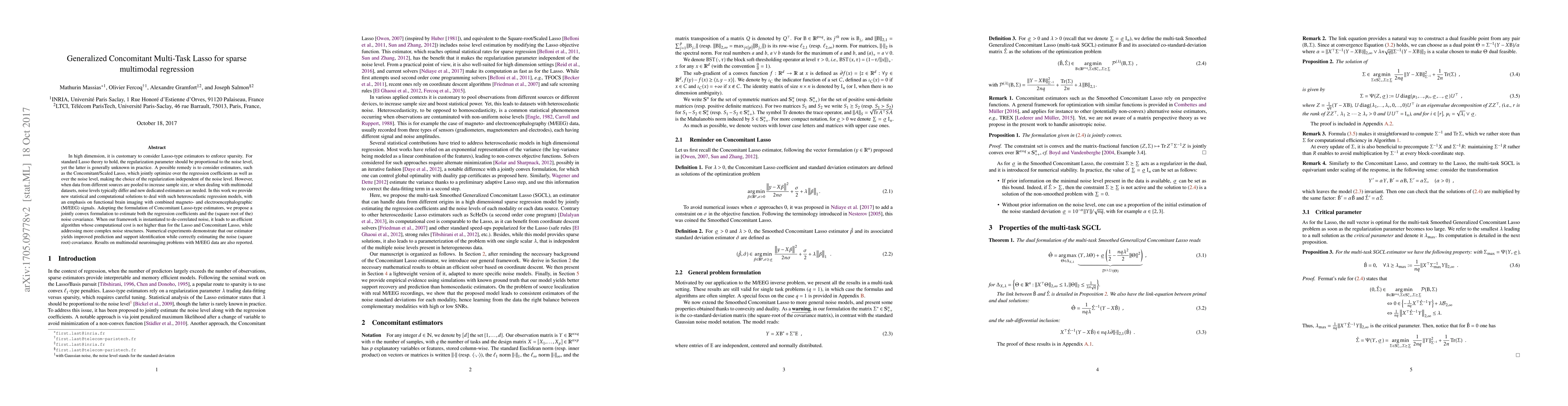 In high dimension, it is customary to consider Lasso-type estimators to enforce sparsity. For standard Lasso theory to hold, the regularization parameter should be proportional to the noise level, yet the latter is generally unknown in practice. A possible remedy is to consider estimators, such as the Concomitant/Scaled Lasso, which jointly optimize over the regression coefficients as well as over the noise level, making the choice of the regularization independent of the noise level. However, when data from different sources are pooled to increase sample size, or when dealing with multimodal datasets, noise levels typically differ and new dedicated estimators are needed. In this work we provide new statistical and computational solutions to deal with such heteroscedastic regression models, with an emphasis on functional brain imaging with combined magneto- and electroencephalographic (M/EEG) signals. Adopting the formulation of Concomitant Lasso-type estimators, we propose a jointly convex formulation to estimate both the regression coefficients and the (square root of the) noise covariance. When our framework is instantiated to de-correlated noise, it leads to an efficient algorithm whose computational cost is not higher than for the Lasso and Concomitant Lasso, while addressing more complex noise structures. Numerical experiments demonstrate that our estimator yields improved prediction and support identification while correctly estimating the noise (square root) covariance. Results on multimodal neuroimaging problems with M/EEG data are also reported.