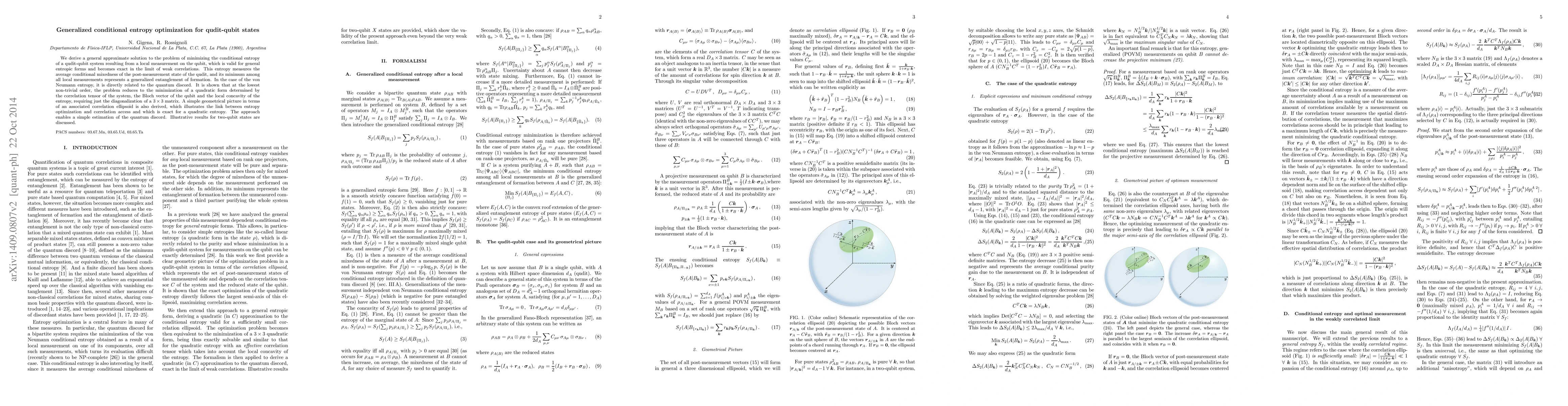 We derive a general approximate solution to the problem of minimizing the conditional entropy of a qudit-qubit system resulting from a local projective measurement on the qubit, which is valid for general entropic forms and becomes exact in the limit of weak correlations. This entropy measures the average conditional mixedness of the post-measurement state of the qudit, and its minimum among all local measurements represents a generalized entanglement of formation. In the case of the von Neumann entropy, it is directly related to the quantum discord. It is shown that at the lowest non-trivial order, the problem reduces to the minimization of a quadratic form determined by the correlation tensor of the system, the Bloch vector of the qubit and the local concavity of the entropy, requiring just the diagonalization of a $3\times 3$ matrix. A simple geometrical picture in terms of an associated correlation ellipsoid is also derived, which illustrates the link between entropy optimization and correlation access and which is exact for a quadratic entropy. The approach enables a simple estimation of the quantum discord. Illustrative results for two-qubit states are discussed.