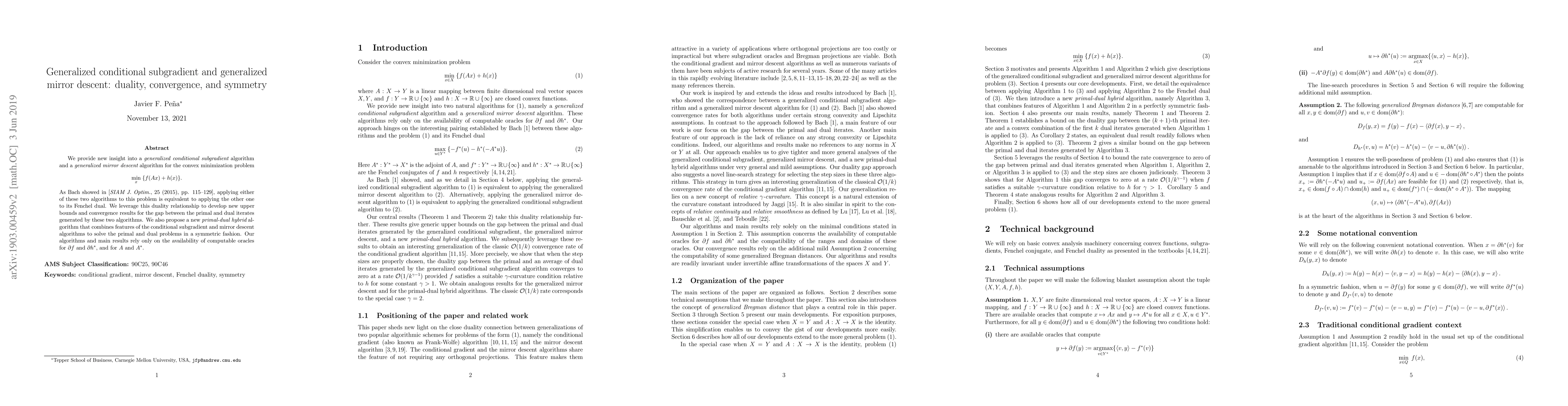 We provide new insight into a {\em generalized conditional subgradient} algorithm and a {\em generalized mirror descent} algorithm for the convex minimization problem \[ \min_x \; \{f(Ax) + h(x)\}.\] As Bach showed in [{\em SIAM J. Optim.}, 25 (2015), pp. 115--129], applying either of these two algorithms to this problem is equivalent to applying the other one to its Fenchel dual. We leverage this duality relationship to develop new upper bounds and convergence results for the gap between the primal and dual iterates generated by these two algorithms. We also propose a new {\em primal-dual hybrid} algorithm that combines features of the conditional subgradient and mirror descent algorithms to solve the primal and dual problems in a symmetric fashion. Our algorithms and main results rely only on the availability of computable oracles for $\partial f$ and $\partial h^*$, and for $A$ and $A^*$.