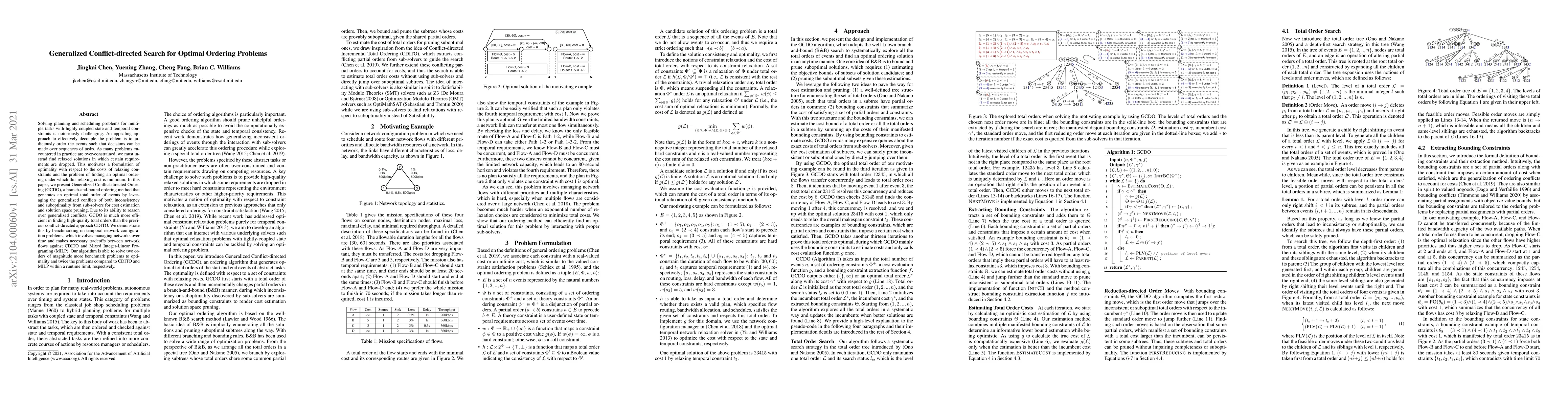 This paper introduces Generalized Conflict-directed Ordering (GCDO), a branch-and-bound method for solving optimal ordering problems in planning and scheduling, which leverages generalized conflicts for efficient solution space pruning. GCDO outperforms previous methods like CDITO and MILP, solving more problems within a given runtime.