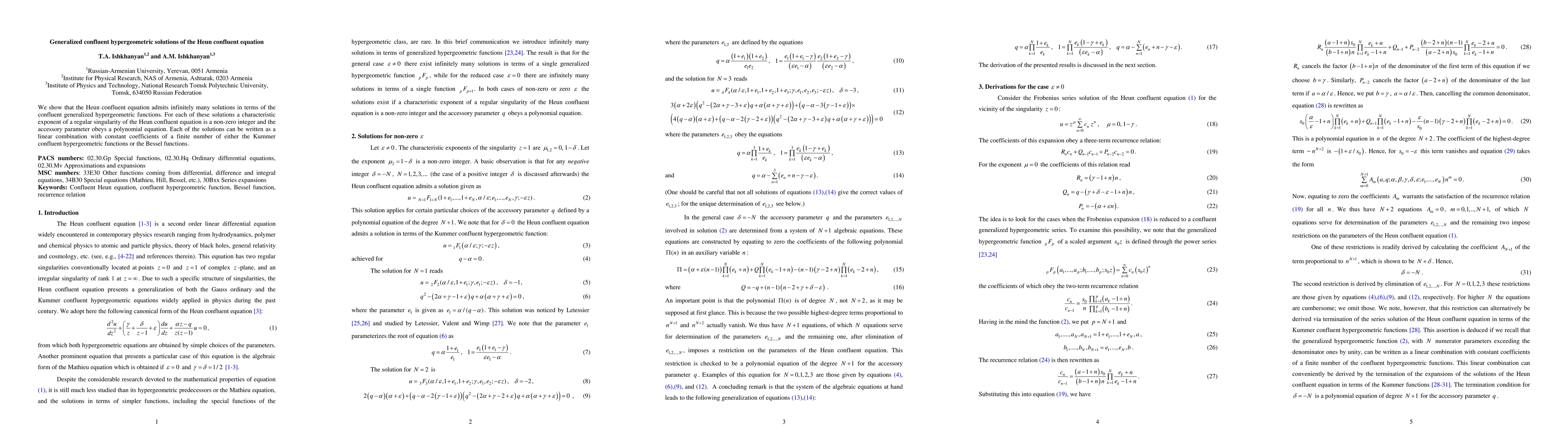 This research demonstrates that the Heun confluent equation has infinitely many solutions expressed via confluent generalized hypergeometric functions, with each solution associated with a non-zero integer exponent at a regular singularity, and an accessory parameter satisfying a polynomial equation. These solutions can be represented as linear combinations of Kummer hypergeometric functions or Bessel functions.