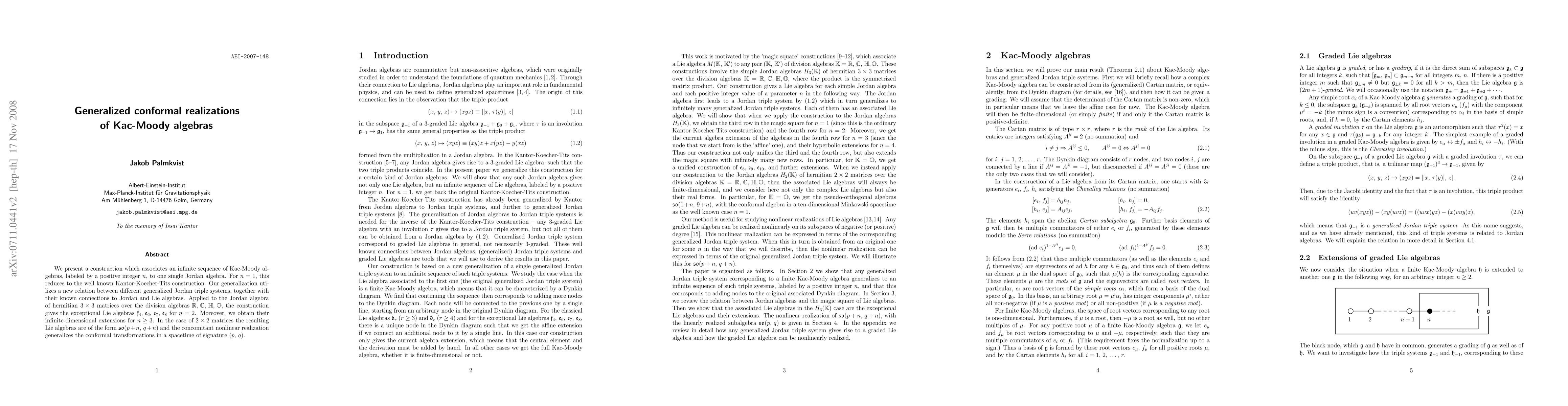 We present a construction which associates an infinite sequence of Kac-Moody algebras, labeled by a positive integer n, to one single Jordan algebra. For n=1, this reduces to the well known Kantor-Koecher-Tits construction. Our generalization utilizes a new relation between different generalized Jordan triple systems, together with their known connections to Jordan and Lie algebras. Applied to the Jordan algebra of hermitian 3x3 matrices over the division algebras R, C, H, O, the construction gives the exceptional Lie algebras f4, e6, e7, e8 for n=2. Moreover, we obtain their infinite-dimensional extensions for n greater or equal to 3. In the case of 2x2 matrices the resulting Lie algebras are of the form so(p+n,q+n) and the concomitant nonlinear realization generalizes the conformal transformations in a spacetime of signature (p,q).