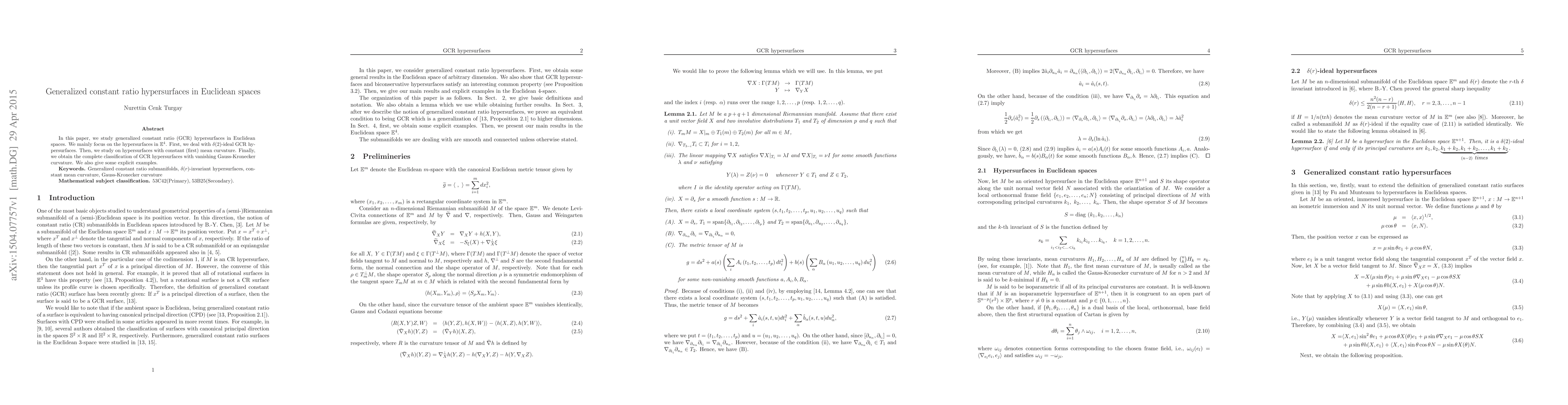In this paper, we study generalized constant ratio (GCR) hypersurfaces in Euclidean spaces. We mainly focus on the hypersurfaces in $\mathbb E^4$. First, we deal with $\delta(2)$-ideal GCR hypersurfaces. Then, we study on hypersurfaces with constant (first) mean curvature. Finally, we obtain the complete classification of GCR hypersurfaces with vanishing Gauss-Kronecker curvature. We also give some explicit examples. Keywords: Generalized constant ratio submanifolds, $\delta(r)$-invariant hypersurfaces, constant mean curvature, Gauss-Kronecker curvature