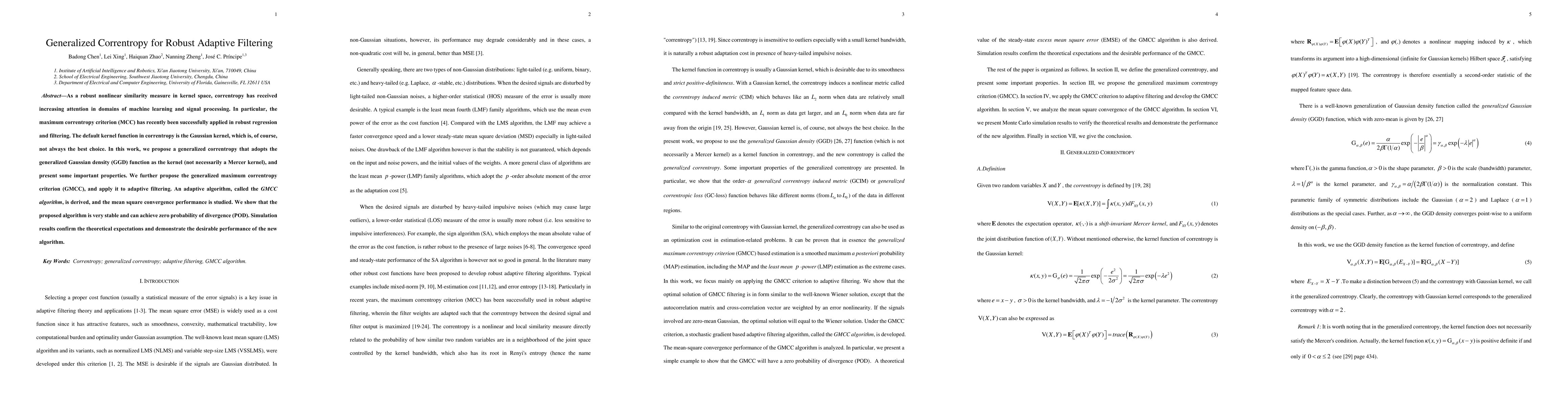 This paper proposes a generalized correntropy using the generalized Gaussian density function as the kernel for robust adaptive filtering, introducing the generalized maximum correntropy criterion (GMCC). The GMCC algorithm demonstrates stability and zero probability of divergence, outperforming traditional methods in simulations.