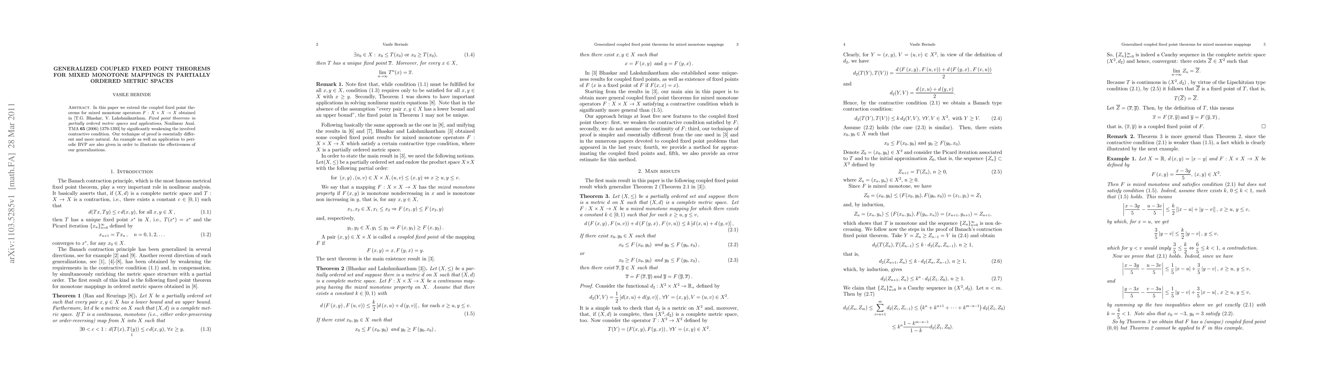 This paper generalizes coupled fixed point theorems for mixed monotone operators in partially ordered metric spaces, by relaxing the contractive condition. A new, more intuitive proof technique is presented, supported by an example and an application to periodic boundary value problems.