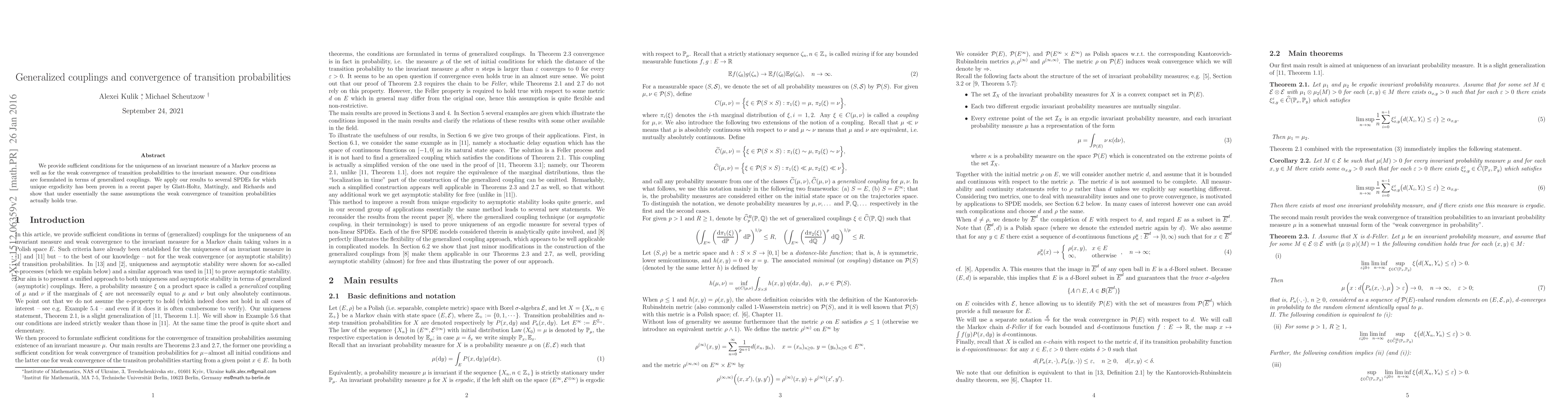 This paper establishes sufficient conditions for the uniqueness of an invariant measure and the weak convergence of transition probabilities in Markov processes using generalized couplings. It applies these results to stochastic partial differential equations (SPDEs) to confirm weak convergence under similar assumptions.