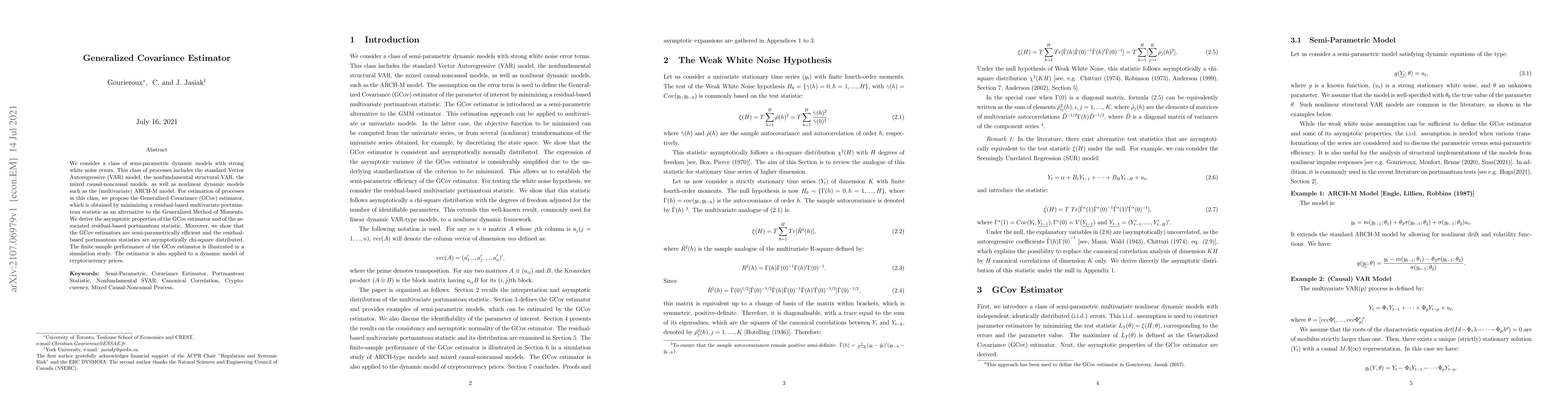 The paper proposes a Generalized Covariance (GCov) estimator for semi-parametric dynamic models with strong white noise errors, including VAR and ARCH-M models. The GCov estimator is shown to be semi-parametrically efficient and its asymptotic properties are derived, with a simulation study demonstrating its finite sample performance.
