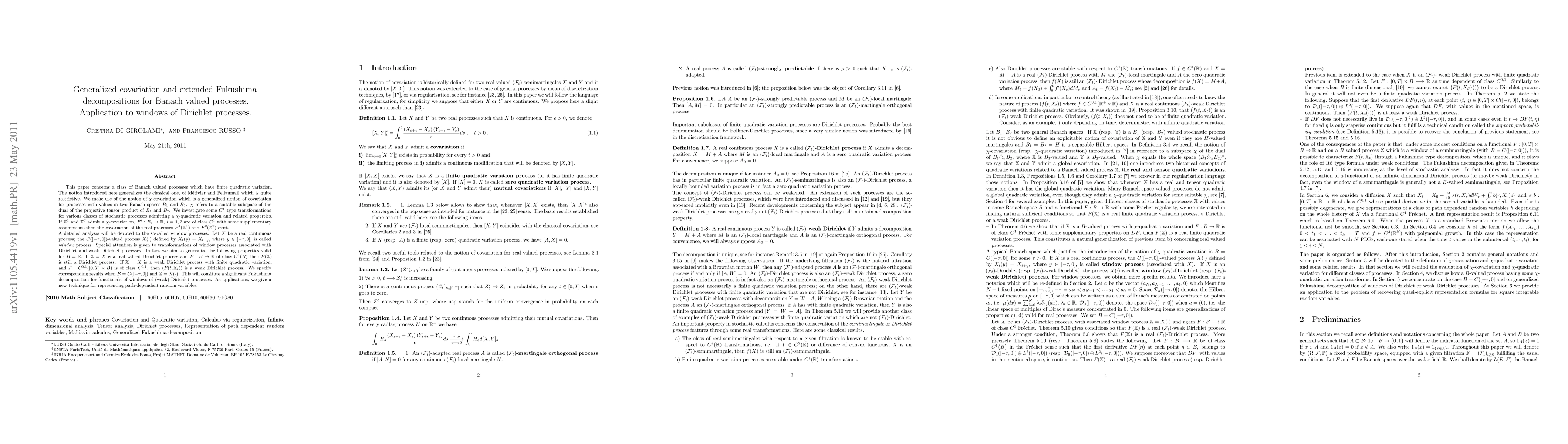 This paper generalizes the concept of covariation for Banach valued processes and introduces $\chi$-covariation, extending Fukushima decomposition. It applies these concepts to window processes of Dirichlet and weak Dirichlet processes, providing a new technique for representing path-dependent random variables.