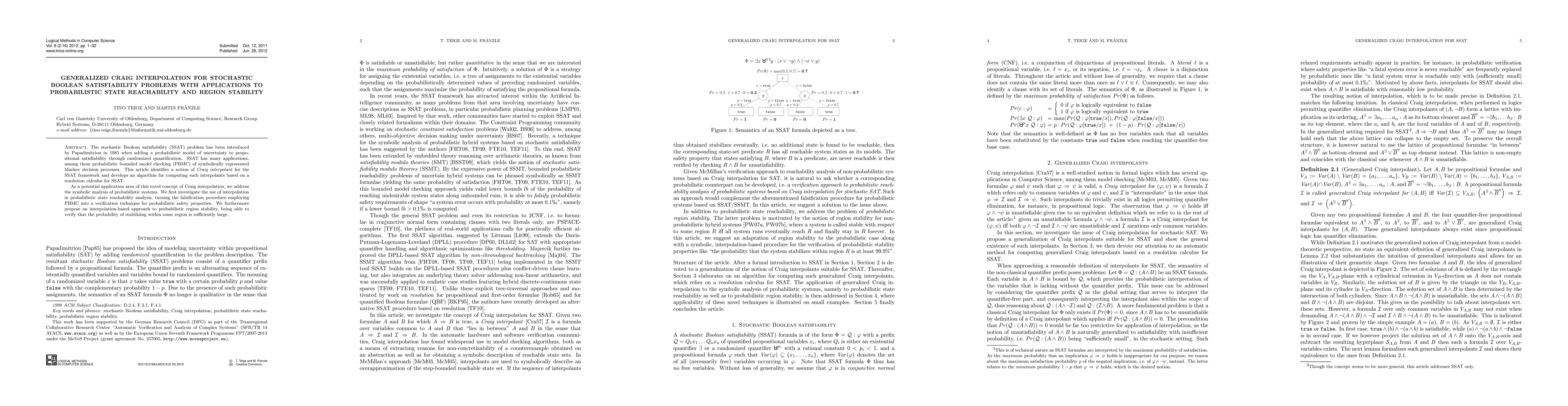 This paper develops a generalized Craig interpolation method for stochastic Boolean satisfiability problems (SSAT) and applies it to probabilistic state reachability and region stability in symbolic analysis of probabilistic systems. The proposed interpolation-based techniques transform falsification into verification for probabilistic safety properties.