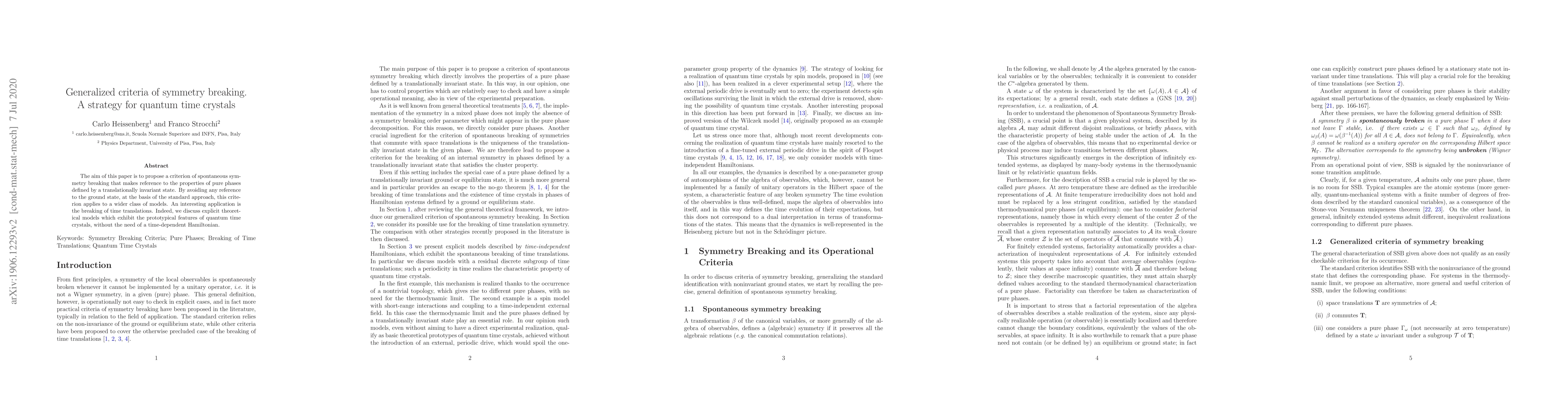 Researchers propose a new criterion for spontaneous symmetry breaking in quantum systems, applicable to time crystals without relying on ground states. They identify models exhibiting prototypical features of quantum time crystals using a translationally invariant state.