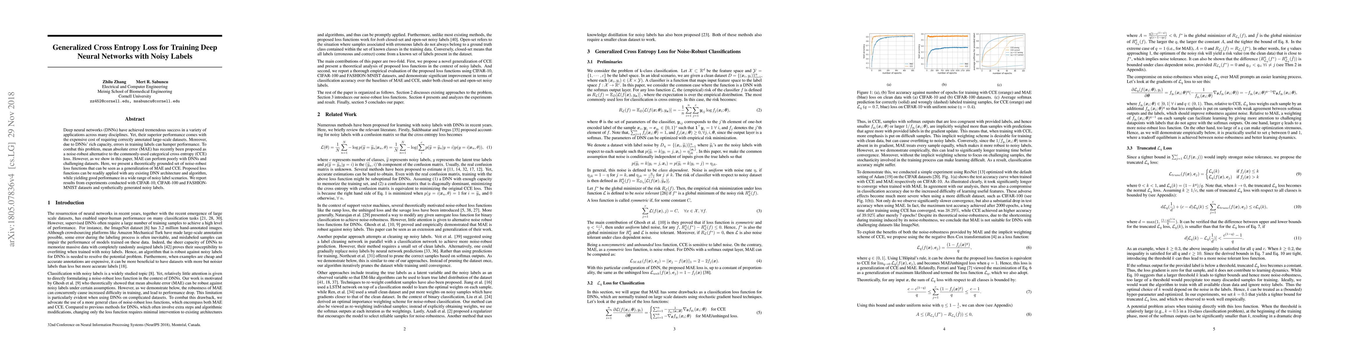 This paper proposes a set of generalized cross entropy loss functions designed to improve the training of deep neural networks under noisy labels, outperforming mean absolute error and categorical cross entropy. The new loss functions show robust performance across various datasets and noise levels.