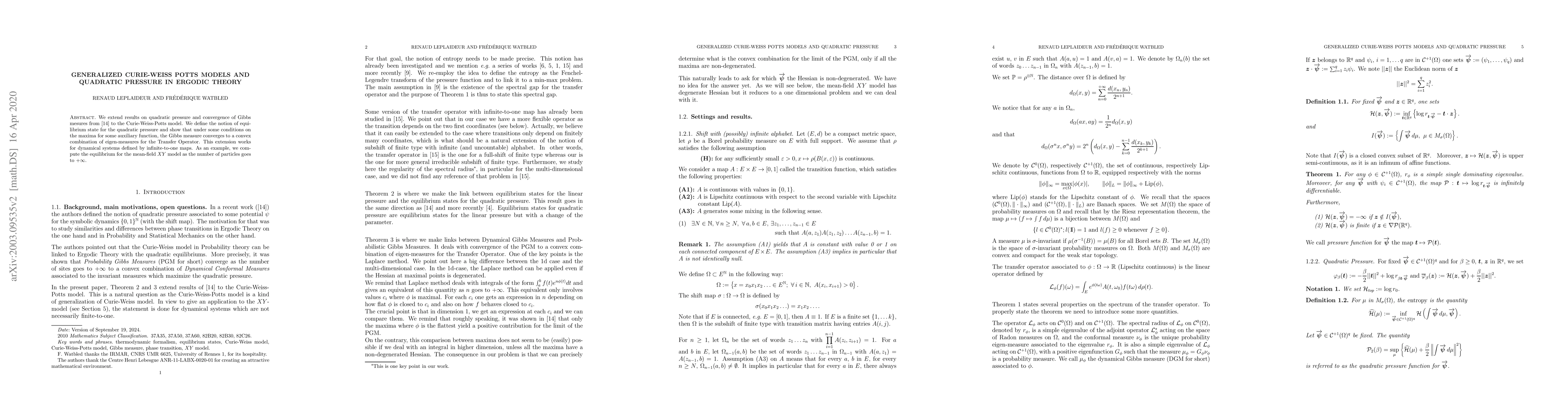 This paper extends the quadratic pressure and Gibbs measure convergence results to the Curie-Weiss-Potts model, defining equilibrium states and showing convergence to a convex combination of eigen-measures under certain conditions. It also applies these findings to infinite-to-one dynamical systems, exemplified by the mean-field $XY$ model.