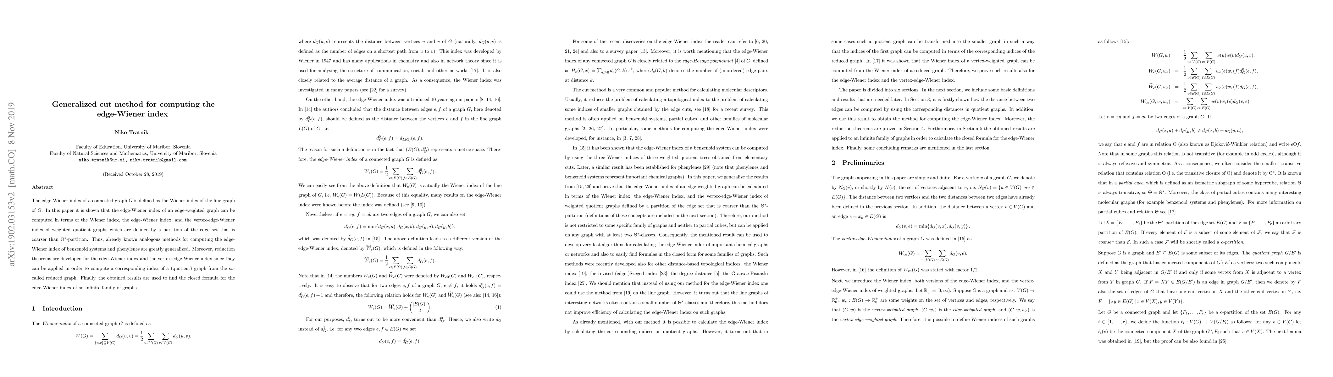 The edge-Wiener index of a connected graph $G$ is defined as the Wiener index of the line graph of $G$. In this paper it is shown that the edge-Wiener index of an edge-weighted graph can be computed in terms of the Wiener index, the edge-Wiener index, and the vertex-edge-Wiener index of weighted quotient graphs which are defined by a partition of the edge set that is coarser than $\Theta^*$-partition. Thus, already known analogous methods for computing the edge-Wiener index of benzenoid systems and phenylenes are greatly generalized. Moreover, reduction theorems are developed for the edge-Wiener index and the vertex-edge-Wiener index since they can be applied in order to compute a corresponding index of a (quotient) graph from the so-called reduced graph. Finally, the obtained results are used to find the closed formula for the edge-Wiener index of an infinite family of graphs.