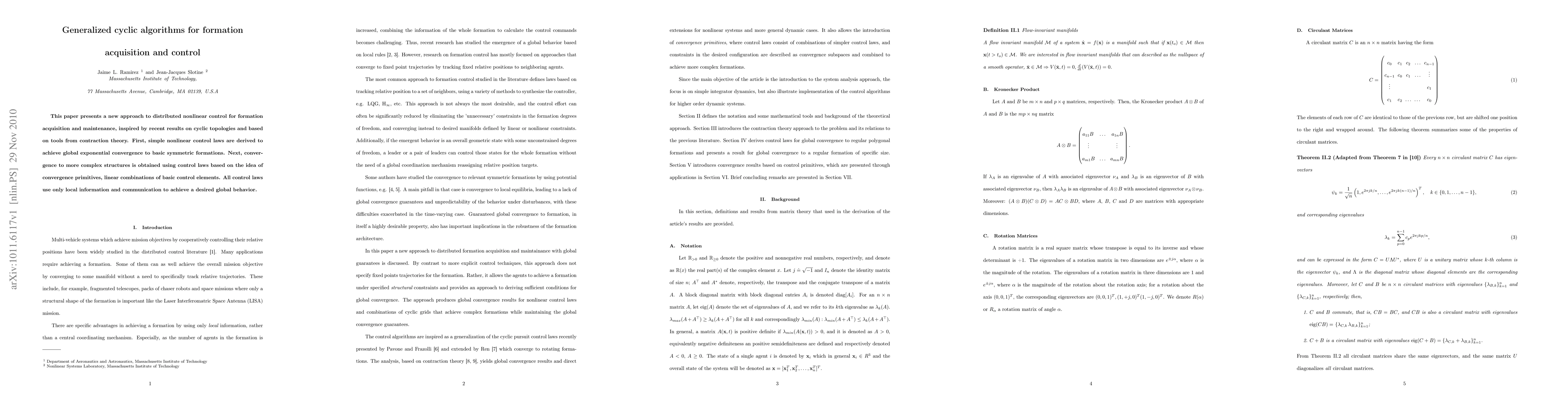 This paper introduces a distributed nonlinear control method for formation acquisition and maintenance using cyclic algorithms and contraction theory, achieving global convergence to basic and complex formations through locally informed control laws.