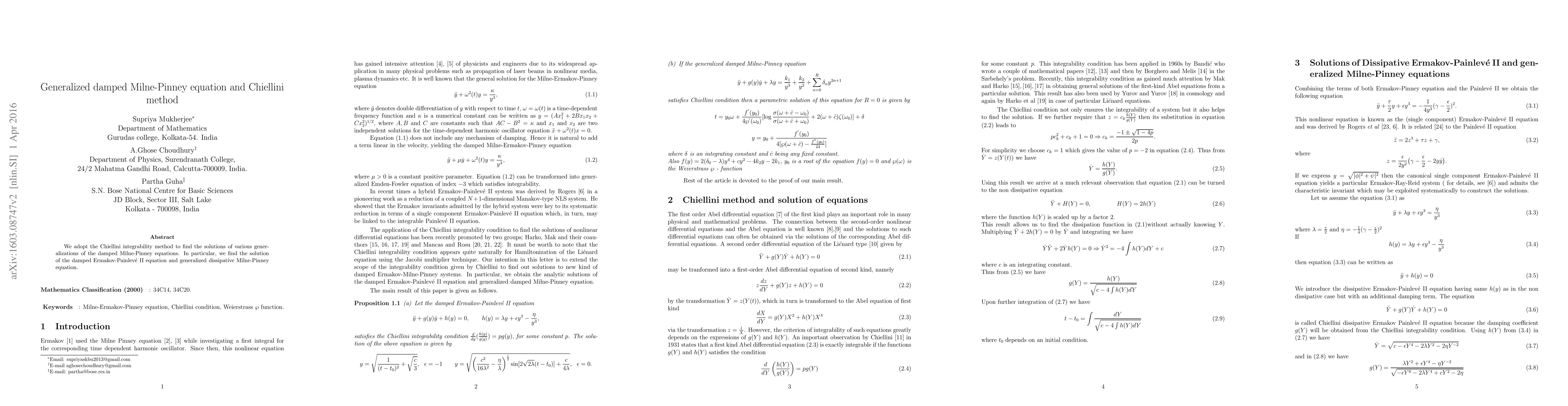 This paper utilizes the Chiellini integrability method to solve generalized versions of the damped Milne-Pinney equations, including the damped Ermakov-Painlevé II equation and the generalized dissipative Milne-Pinney equation. The method provides new insights into these complex differential equations.