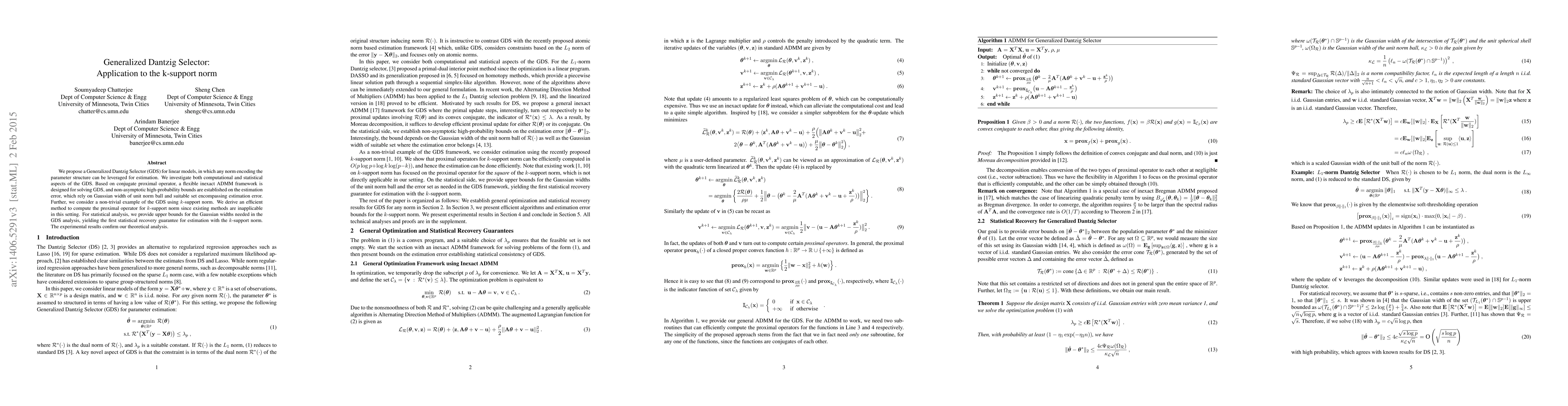 This paper proposes a Generalized Dantzig Selector (GDS) for linear models that utilizes any norm to encode parameter structure, and develops a flexible inexact ADMM framework for its solution. It provides statistical recovery guarantees for the $k$-support norm and confirms theoretical results with experimental validation.