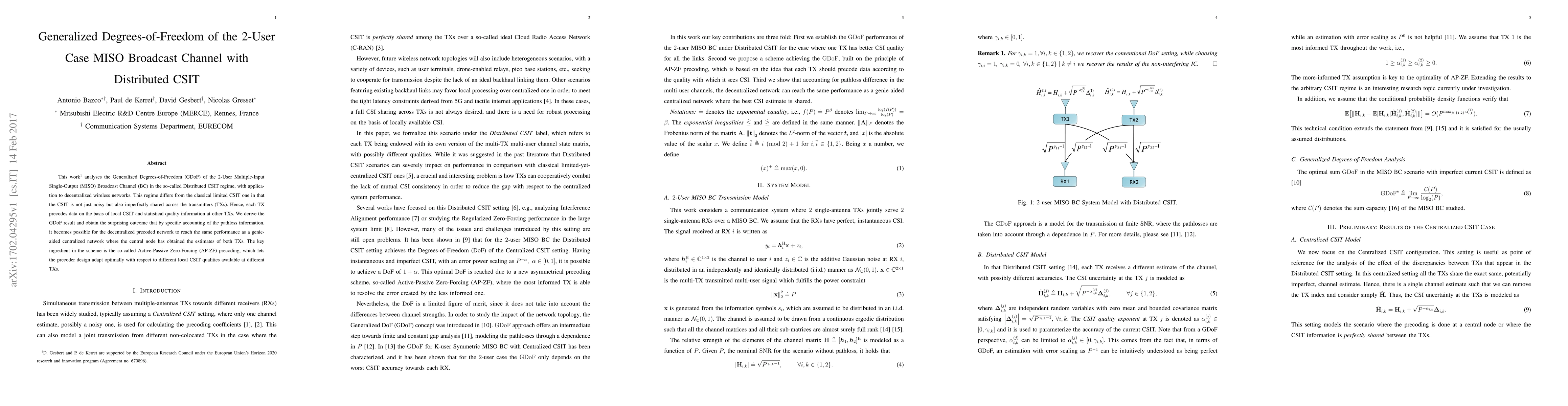 This work analyses the Generalized Degrees-of-Freedom (GDoF) of the 2-User Multiple-Input Single-Output (MISO) Broadcast Channel (BC) in the so-called Distributed CSIT regime, with application to decentralized wireless networks. This regime differs from the classical limited CSIT one in that the CSIT is not just noisy but also imperfectly shared across the transmitters (TXs). Hence, each TX precodes data on the basis of local CSIT and statistical quality information at other TXs. We derive the GDoF result and obtain the surprising outcome that by specific accounting of the pathloss information, it becomes possible for the decentralized precoded network to reach the same performance as a genie-aided centralized network where the central node has obtained the estimates of both TXs. The key ingredient in the scheme is the so-called Active-Passive Zero-Forcing (AP-ZF) precoding, which lets the precoder design adapt optimally with respect to different local CSIT qualities available at different TXs.