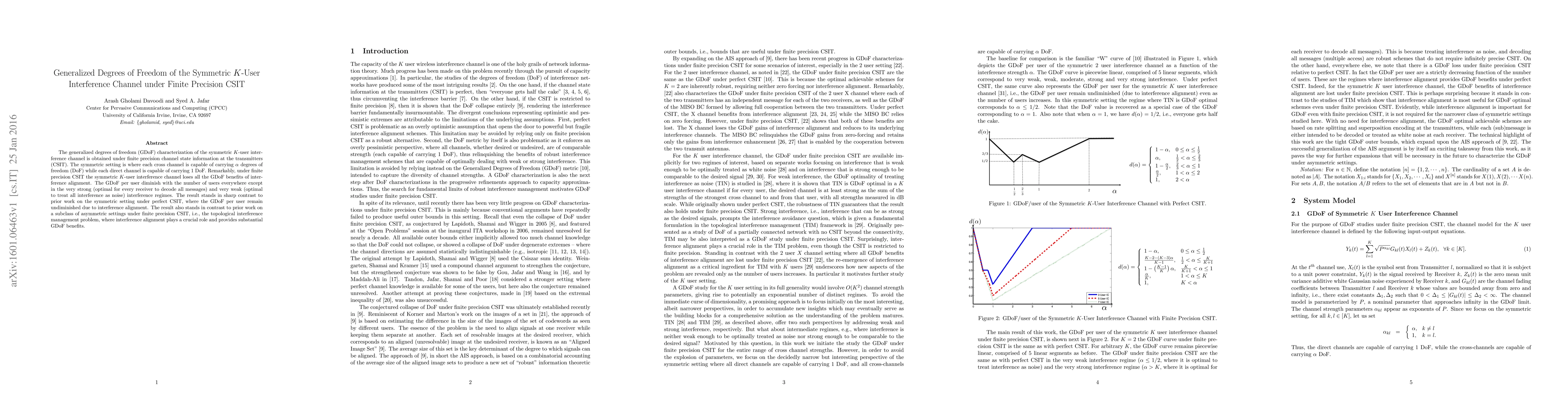 This paper characterizes the generalized degrees of freedom (GDoF) for the symmetric K-user interference channel under finite precision channel state information at the transmitters (CSIT). It finds that finite precision CSIT diminishes the GDoF per user, contrasting with the benefits seen under perfect CSIT due to interference alignment.