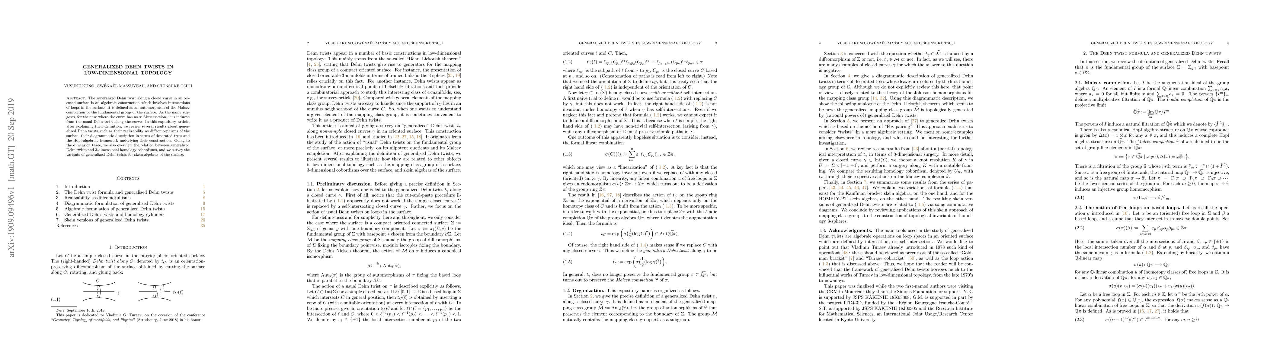 This paper defines generalized Dehn twists in low-dimensional topology, explaining their algebraic construction and relation to usual Dehn twists. It reviews their realizability as surface diffeomorphisms, their diagrammatic representation, and their connection to 3-dimensional homology cobordisms.