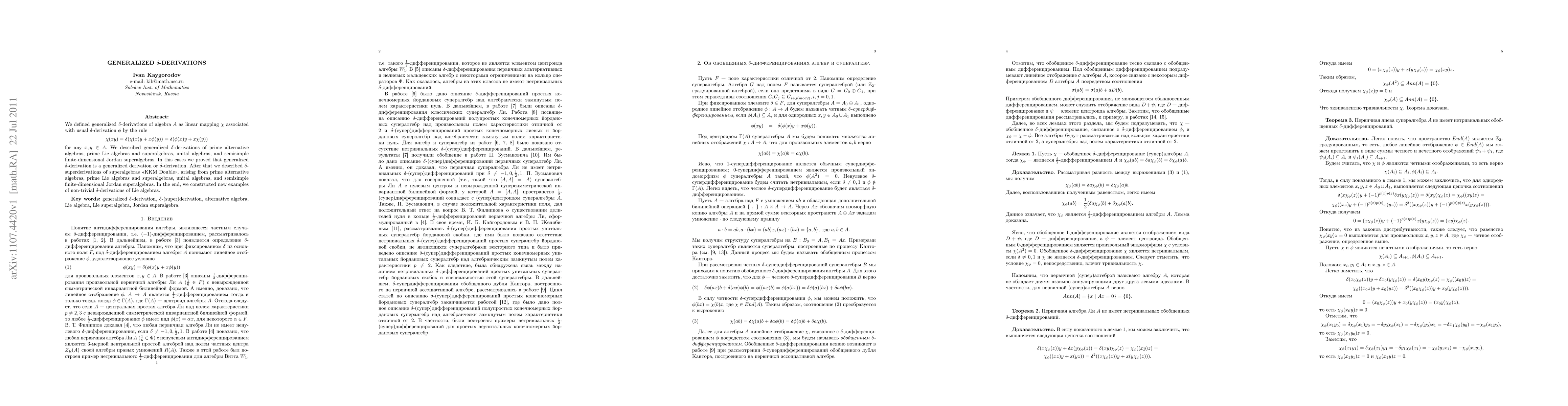 The paper defines generalized δ-derivations in algebra A and explores their properties in various types of algebras, including prime alternative algebras, prime Lie algebras, superalgebras, unital algebras, and semisimple finite-dimensional Jordan superalgebras. It also examines δ-superderivations and provides new examples of non-trivial δ-derivations in Lie algebras.