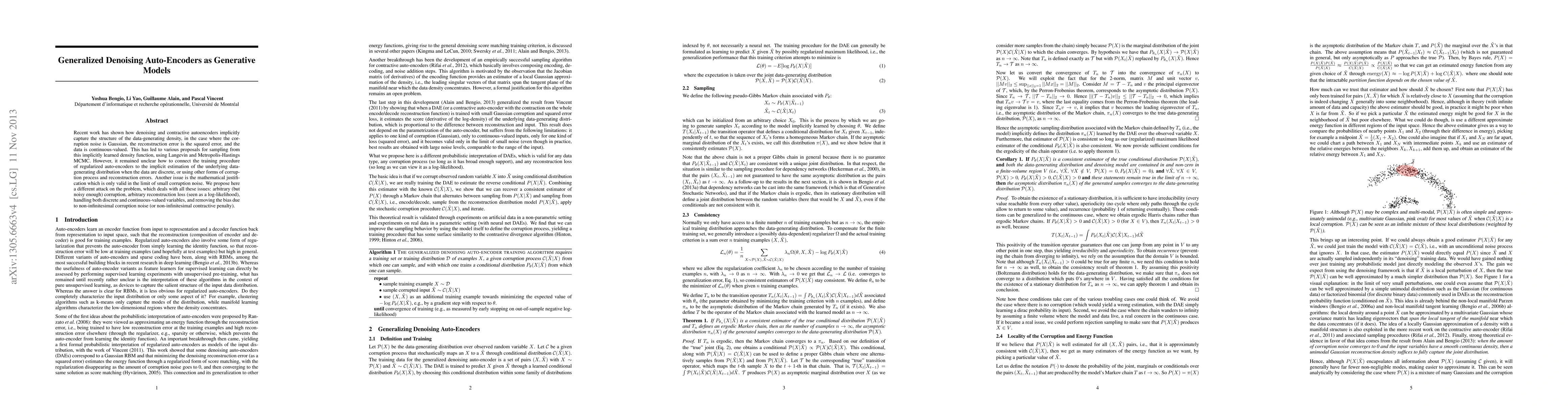 This paper proposes generalized denoising auto-encoders to model data-generating distributions, addressing issues with discrete data and non-infinitesimal noise, and offering a flexible framework for various reconstruction losses and corruption processes. The approach aims to provide a mathematical justification beyond the small noise limit.