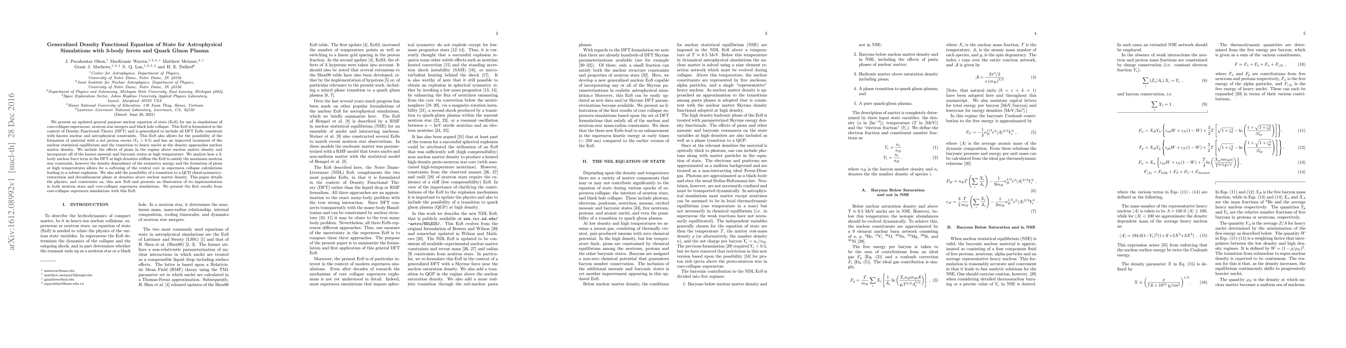This paper updates a general nuclear equation of state (EoS) for astrophysical simulations, formulated in Density Functional Theory (DFT) to include 3-body forces and quark-gluon plasma. The EoS incorporates pion effects and a transition to a deconfined phase at high densities, enabling robust supernova explosions and neutron star constraints.