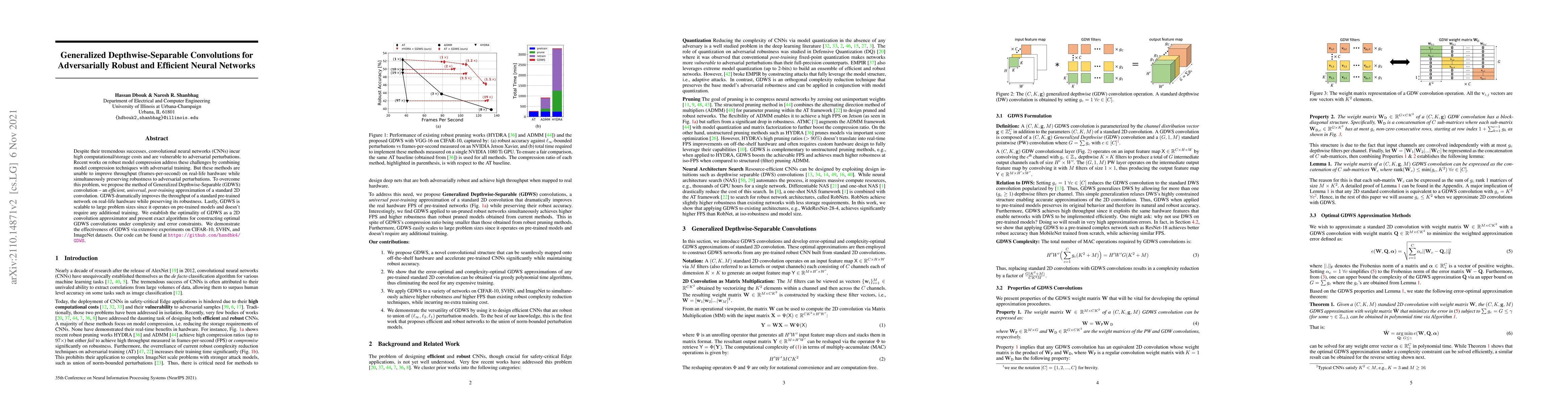 Despite their tremendous successes, convolutional neural networks (CNNs) incur high computational/storage costs and are vulnerable to adversarial perturbations. Recent works on robust model compression address these challenges by combining model compression techniques with adversarial training. But these methods are unable to improve throughput (frames-per-second) on real-life hardware while simultaneously preserving robustness to adversarial perturbations. To overcome this problem, we propose the method of Generalized Depthwise-Separable (GDWS) convolution -- an efficient, universal, post-training approximation of a standard 2D convolution. GDWS dramatically improves the throughput of a standard pre-trained network on real-life hardware while preserving its robustness. Lastly, GDWS is scalable to large problem sizes since it operates on pre-trained models and doesn't require any additional training. We establish the optimality of GDWS as a 2D convolution approximator and present exact algorithms for constructing optimal GDWS convolutions under complexity and error constraints. We demonstrate the effectiveness of GDWS via extensive experiments on CIFAR-10, SVHN, and ImageNet datasets. Our code can be found at https://github.com/hsndbk4/GDWS.