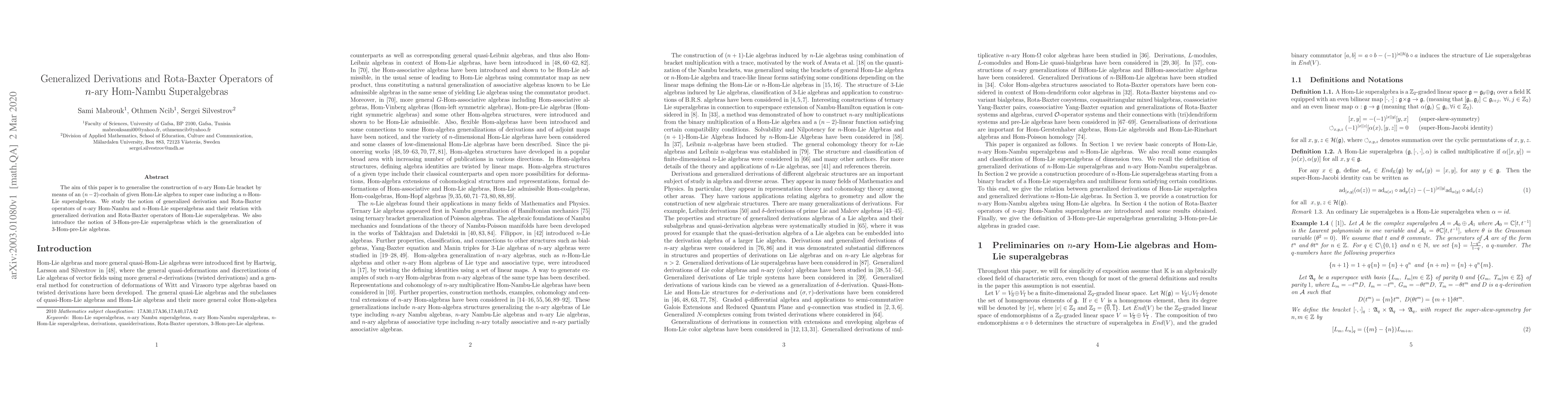 This paper generalizes $n$-ary Hom-Lie brackets to the superalgebra context, constructing $n$-Hom-Lie superalgebras. It investigates generalized derivations and Rota-Baxter operators within these structures, along with introducing $3$-Hom-pre-Lie superalgebras as an extension of $3$-Hom-pre-Lie algebras.