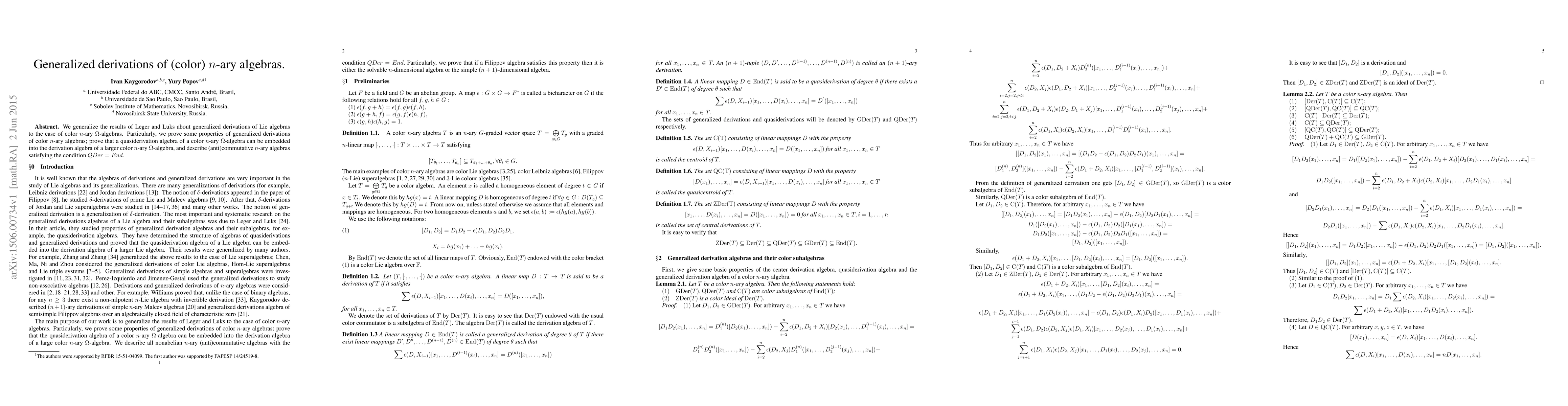 We generalize the results of Leger and Luks about generalized derivations of Lie algebras to the case of color $n$-ary $\Omega$-algebras. Particularly, we prove some properties of generalized derivations of color $n$-ary algebras; prove that a quasiderivation algebra of a color $n$-ary $\Omega$-algebra can be embedded into the derivation algebra of a larger color $n$-ary $\Omega$-algebra, and describe (anti)commutative $n$-ary algebras satisfying the condition $QDer = End.$